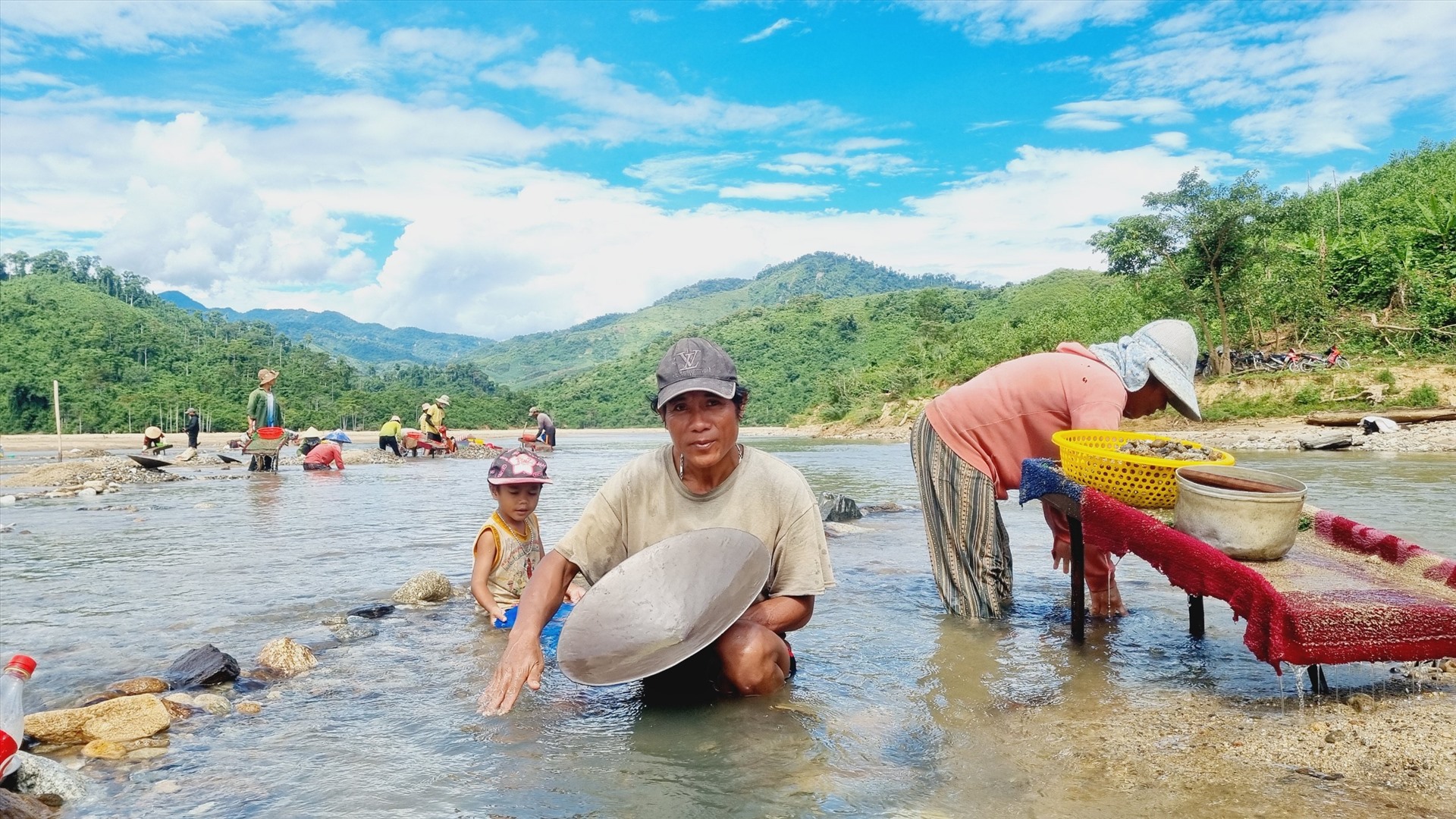 At the section of the river passing through Ba Bay village, people dug holes to scoop soil and put it on carts to the riverbank to process gold. And at the section of the river passing through A Rong Tren village, dozens of people divided into many small groups processed gold on a length of about 100m. The river water in this section is shallow, only reaching the edge of the foot. After processing soil and rocks, people collected tiny gold beads and sold them for about 100,000 - 150,000 VND/day, some lucky people earned about 200,000 VND.