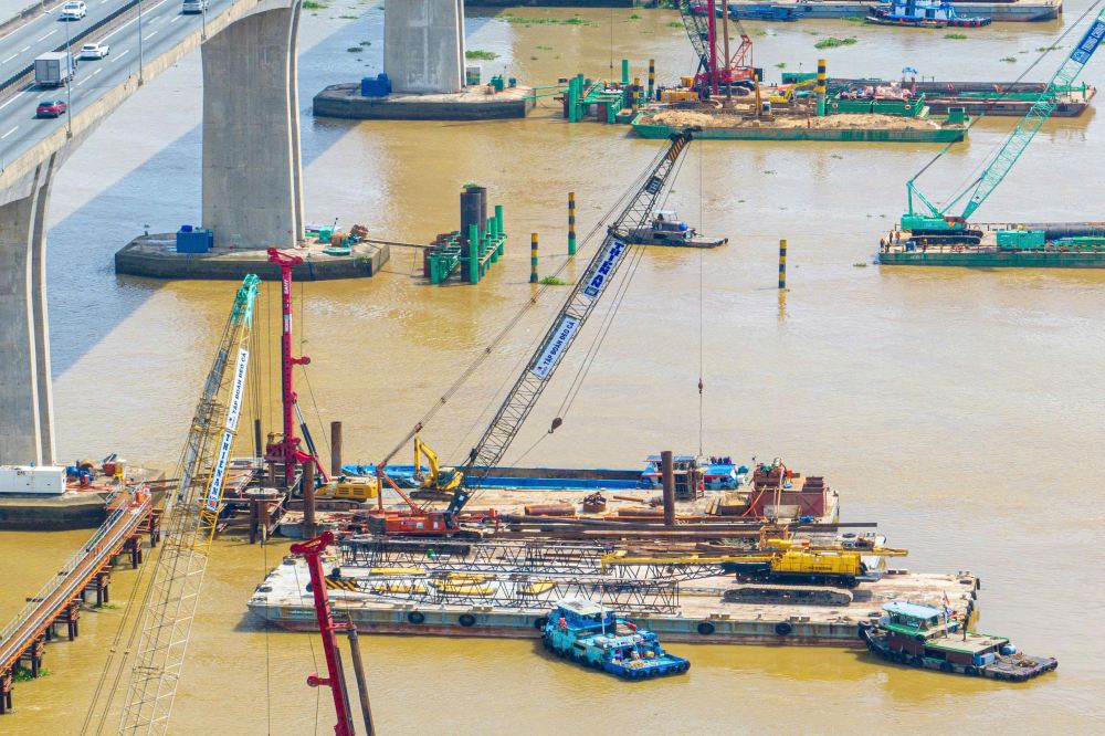 On the Dong Nai River, barges, cranes and drilling machines are operating continuously to construct the new Long Thanh bridge piers, the item that determines the progress of the entire project. On shore, engineers and workers take turns working, focusing on drilling piles, pouring foundations, and supervising techniques.