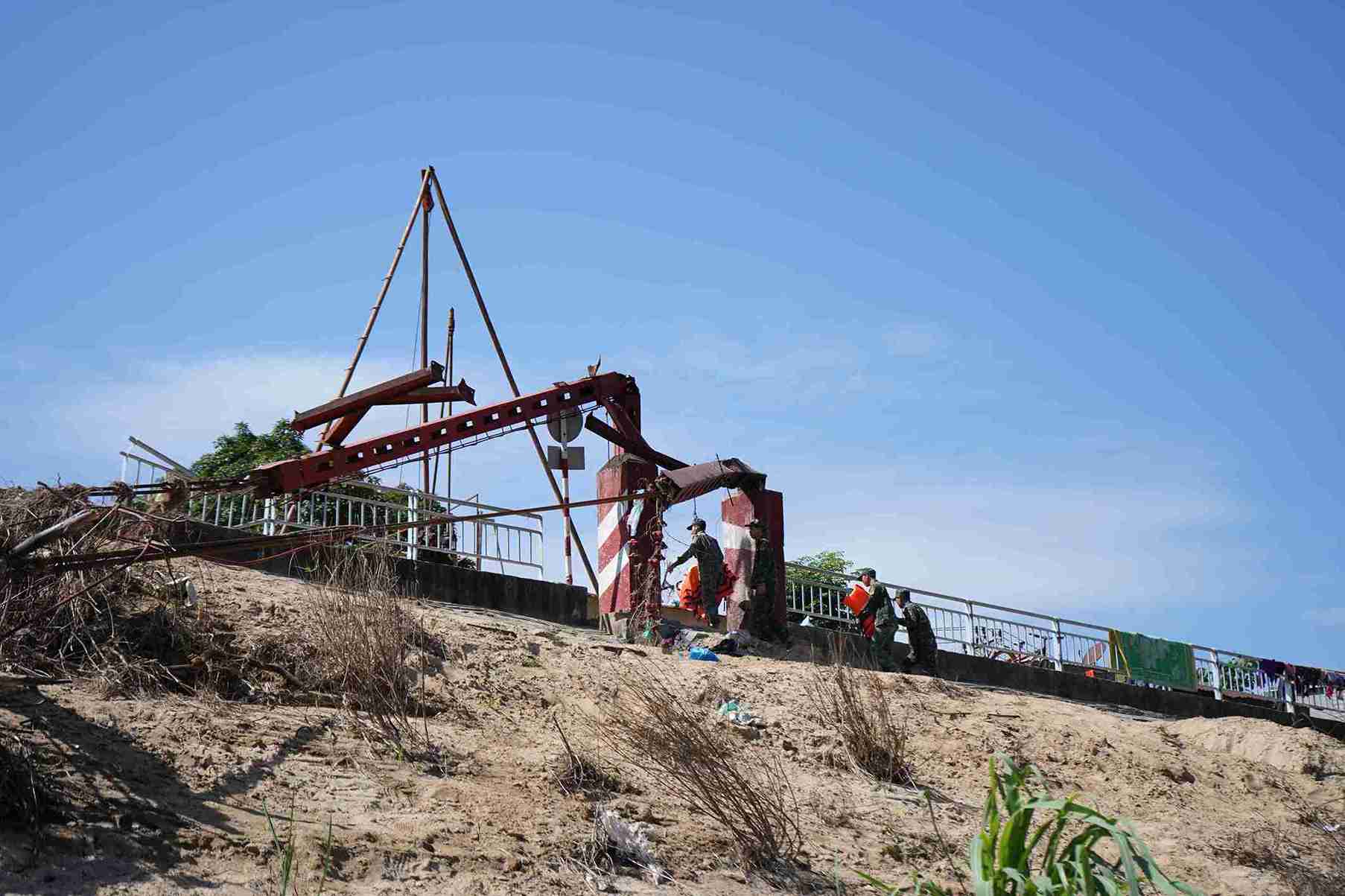 The iron frame of the bridge was knocked out by floods, drifting into the riverbank; dry trees and garbage were piled up on cables, and white sand washed up on both banks.