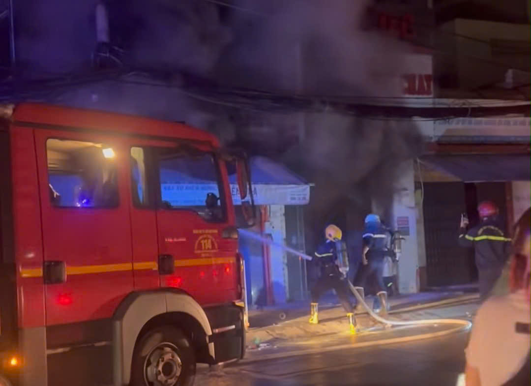 Previously, at around 8:45 p.m., people discovered smoke and fire flaring up fiercely at a house that was used as a store for selling electrical and water appliances on Thong Nhat Street, Thong Tay Hoi Ward. The fire quickly spread, accompanied by a column of black smoke tens of meters high.