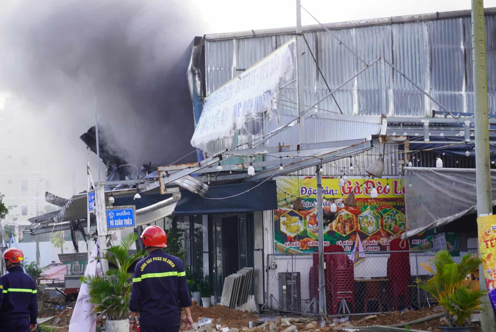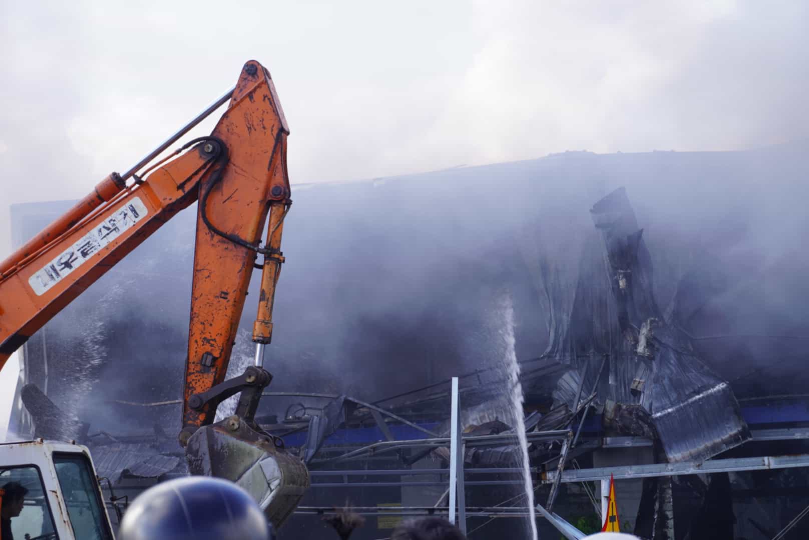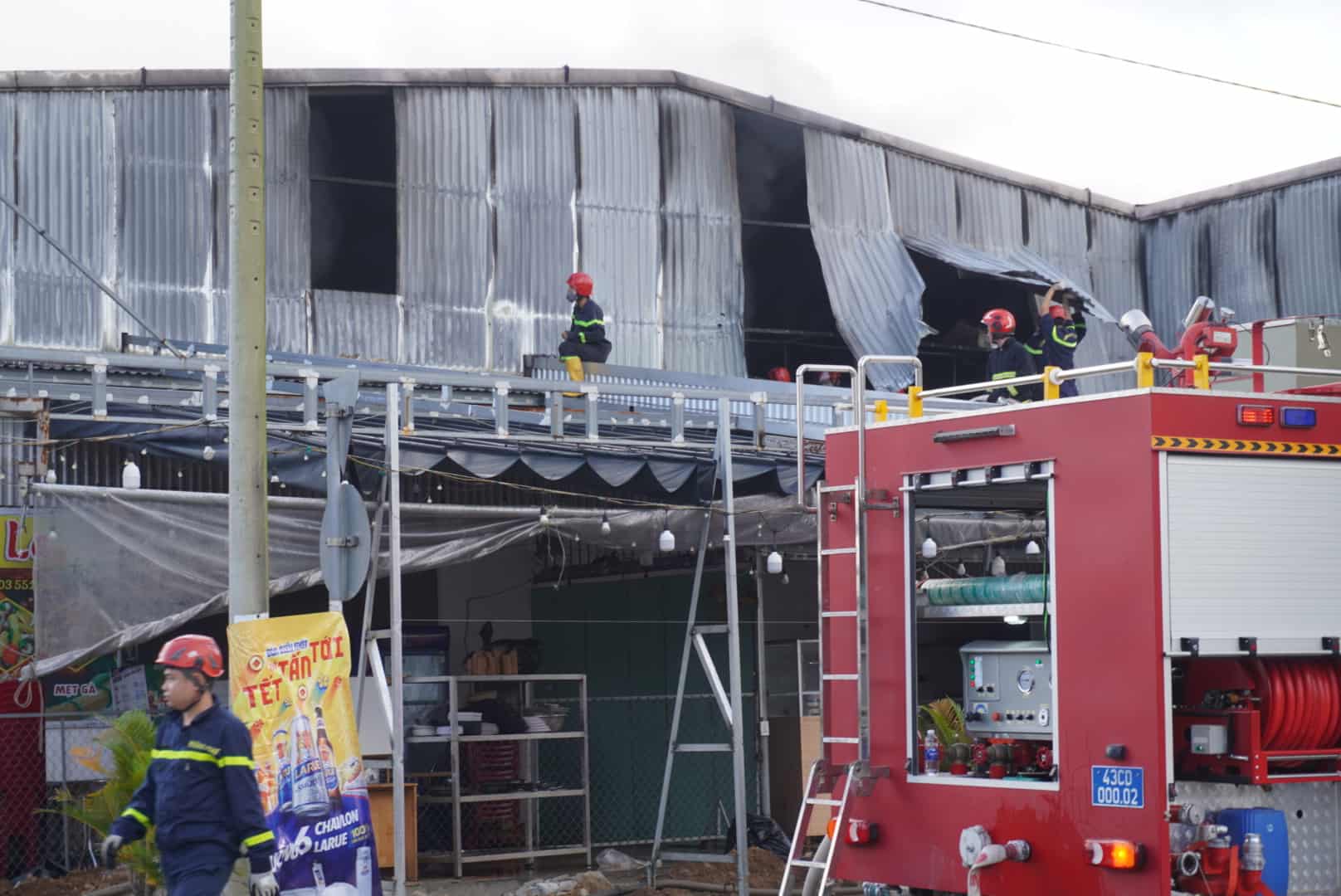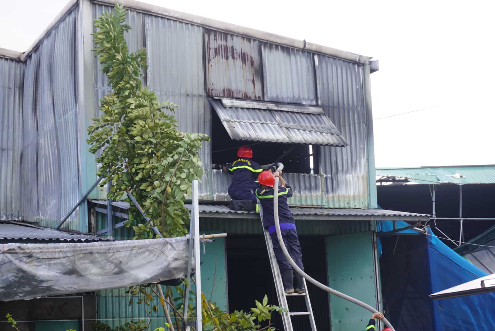 Because the 2nd floor of the store was covered with corrugated iron, spraying water from the outside was difficult, functional forces mobilized crane trucks to break the facade of the factory to create access. After breaking the wall, the fire continued to break out fiercely, and the soldiers had to spray water continuously to control the fire.