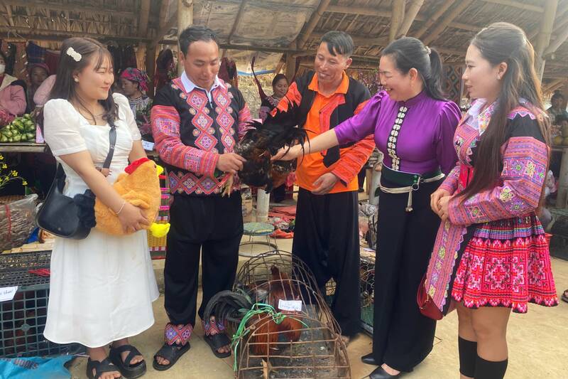 The market has 15 booths selling typical local agricultural products such as black chicken, rice, corn, vegetables, leaf yeast wine, traditional banh day, along with embroidery and handicraft products imbued with national cultural identity.