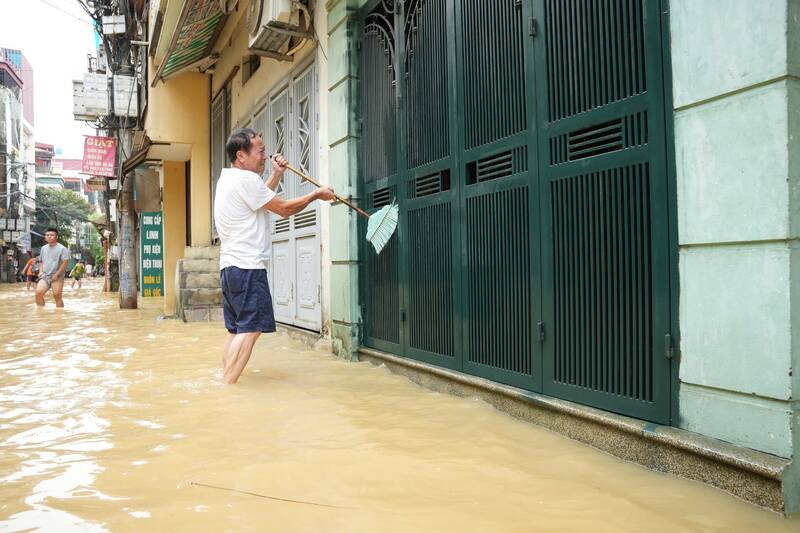 Currently, flood water has receded slightly in some residential areas in Chuong Duong ward. Many households are making efforts to clean up their houses.