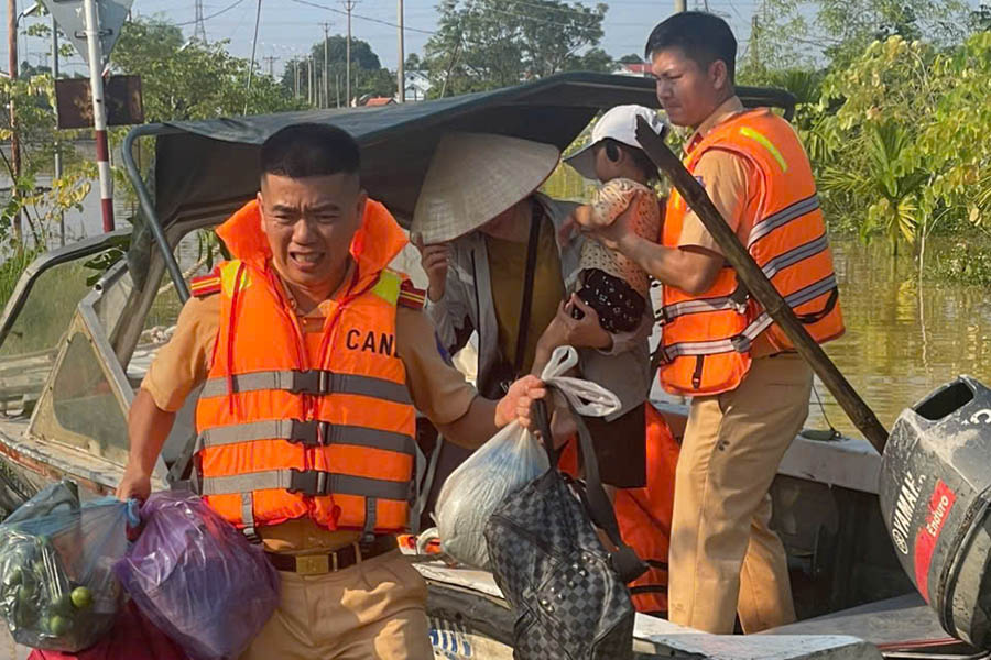 In the recent days of prolonged floods, the images of officers and soldiers of Hanoi Traffic Police wading through water, rowing boats, carrying the elderly, holding children or staying up all night to regulate traffic in the rushing water have left many emotions in the hearts of the people.
