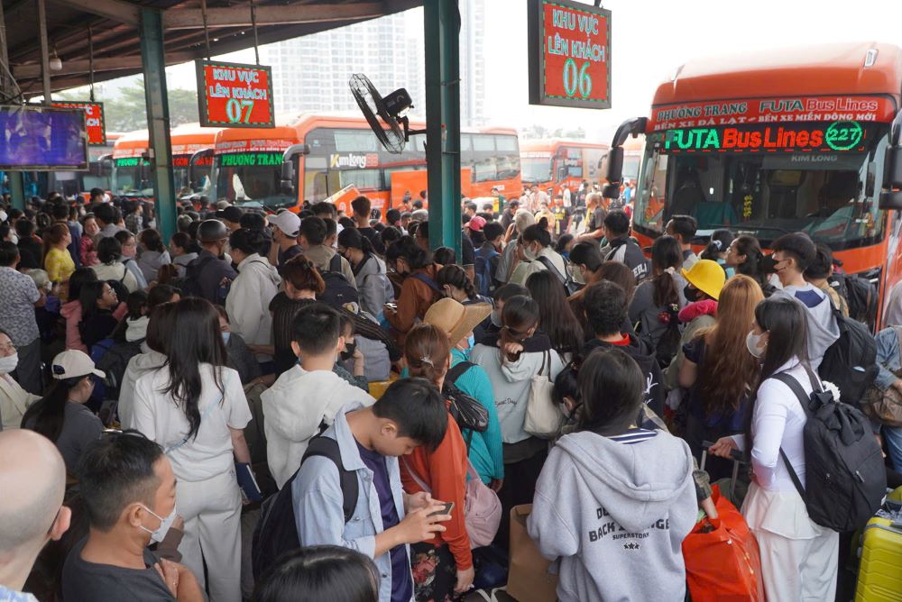Especially, at the ticket counter and waiting hall of Phuong Trang bus company, the crowded situation reached its peak. Long lines of people lined up to get on the bus, the sound of flight announcements rang out continuously. Many passengers had to wait because there were no empty seats left.