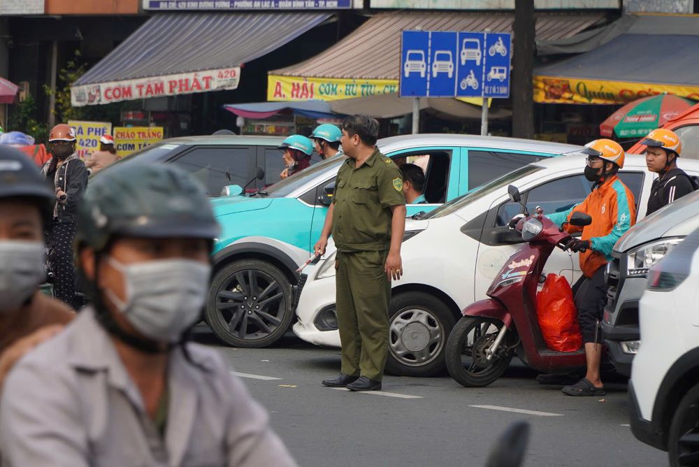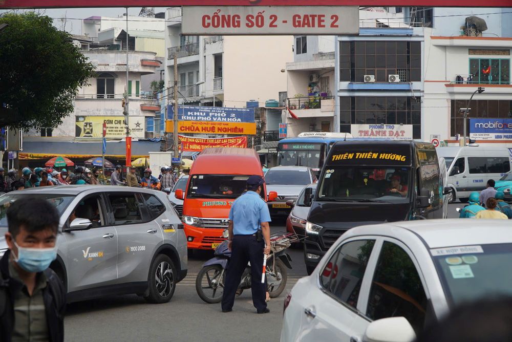 Outside the bus station, the entrance area recorded passenger cars continuously leaving the station. On Kinh Duong Vuong street, functional forces were on duty to regulate traffic, but localized congestion still occurred.