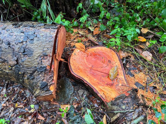 At the scene, the ground in the tree base area has many cuts, the tree base has just been cut with fresh wood. On the concrete path, there are left tree branches, the trunk has been transported away. The area where the trees were cut down had no surveillance cameras, no people, cutting tools or means of transportation were detected at the time of inspection.