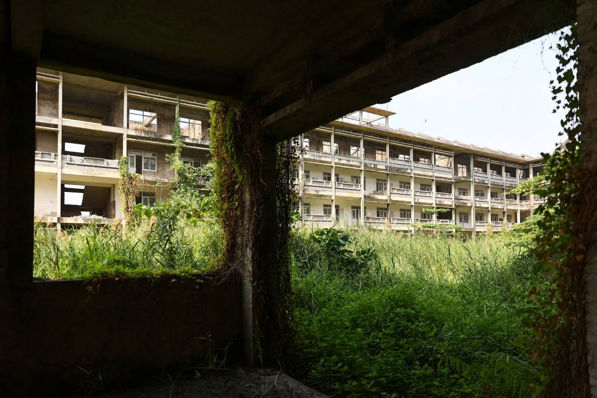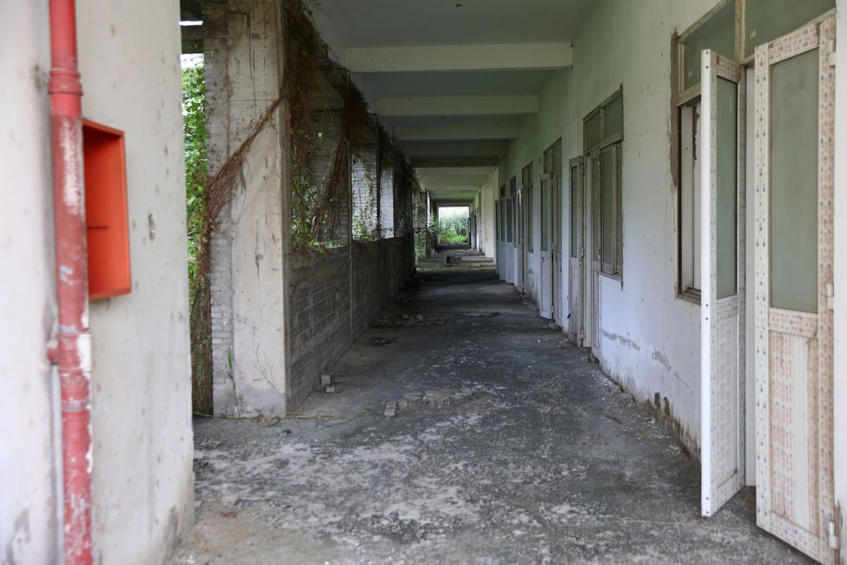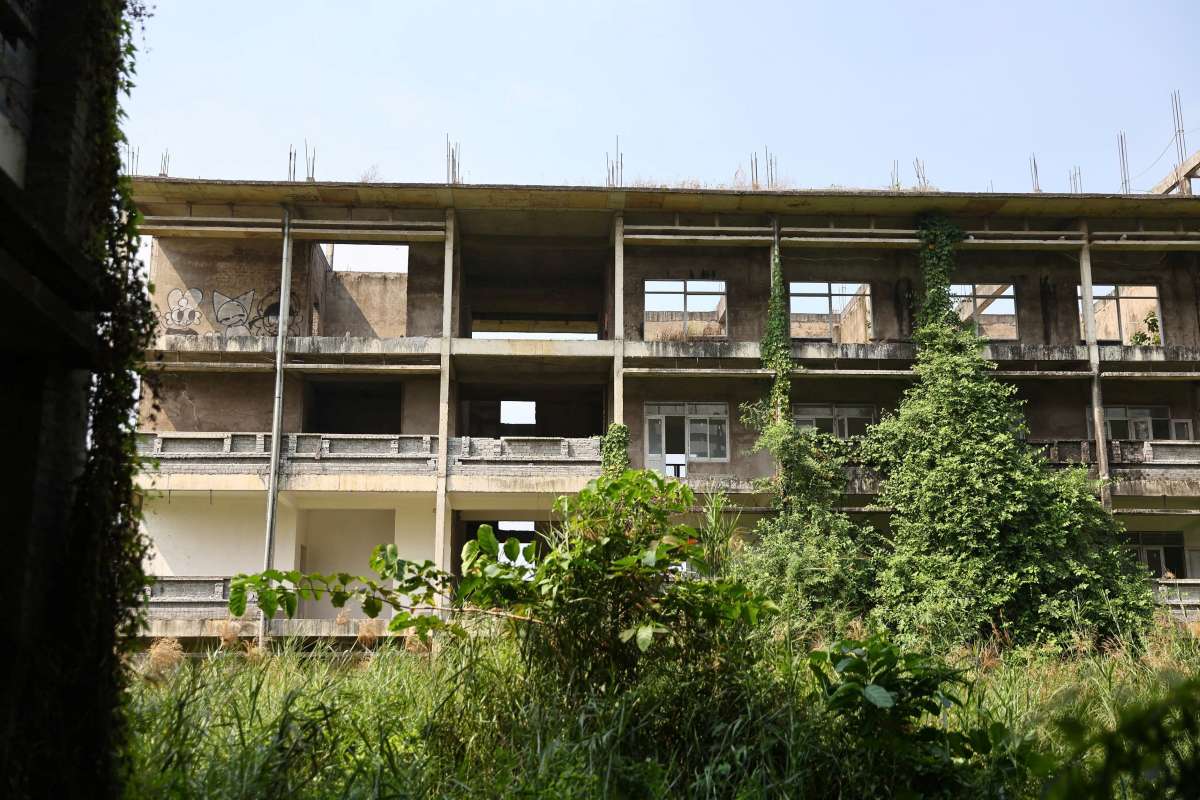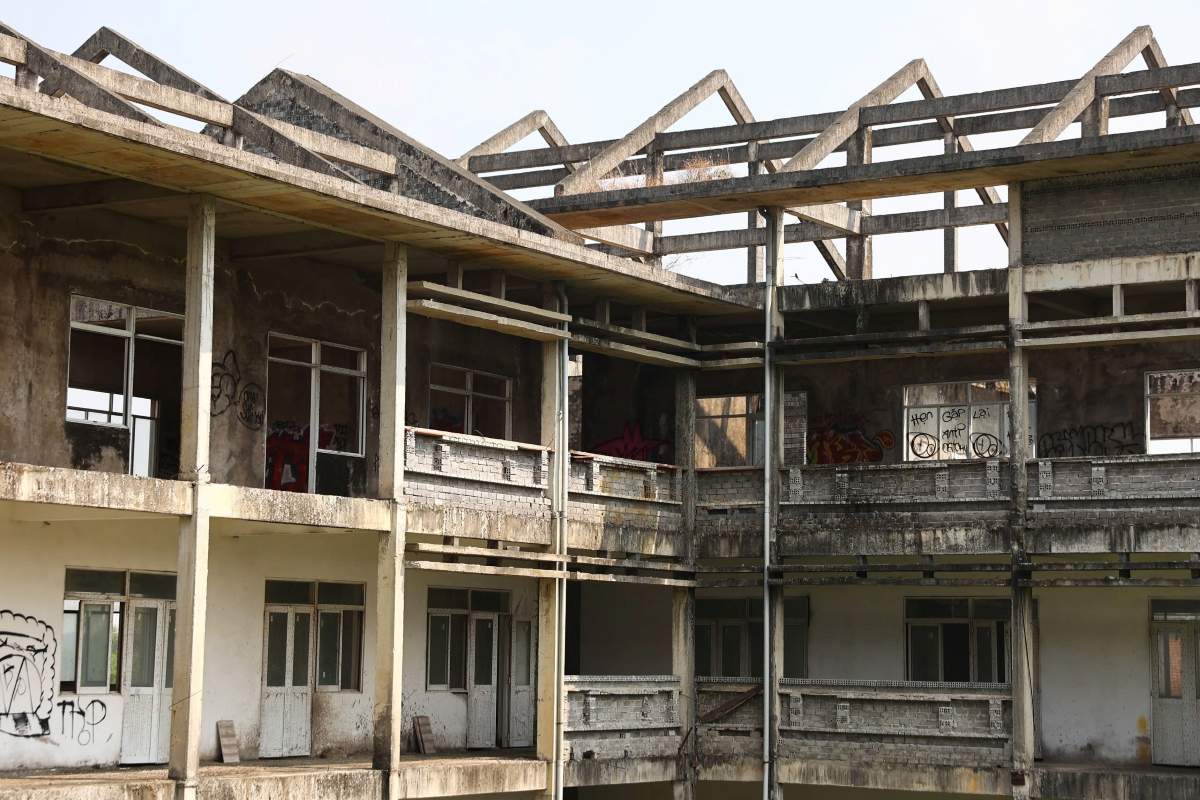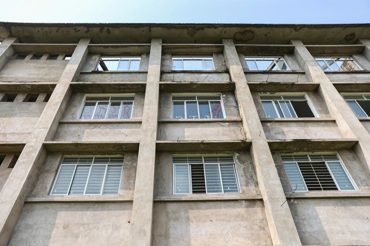 The school is designed in a U-shape with 4-story buildings. However, according to records, the project has only completed the rough structure and is waiting for roofing. Due to being abandoned for a long time, bushes and vines grow lushly covering the surrounding area. Inside, the corridor is covered with moss, the stairs leading to the unfinished construction areas, and iron and steel and construction materials are scattered under the thick layer of dust.