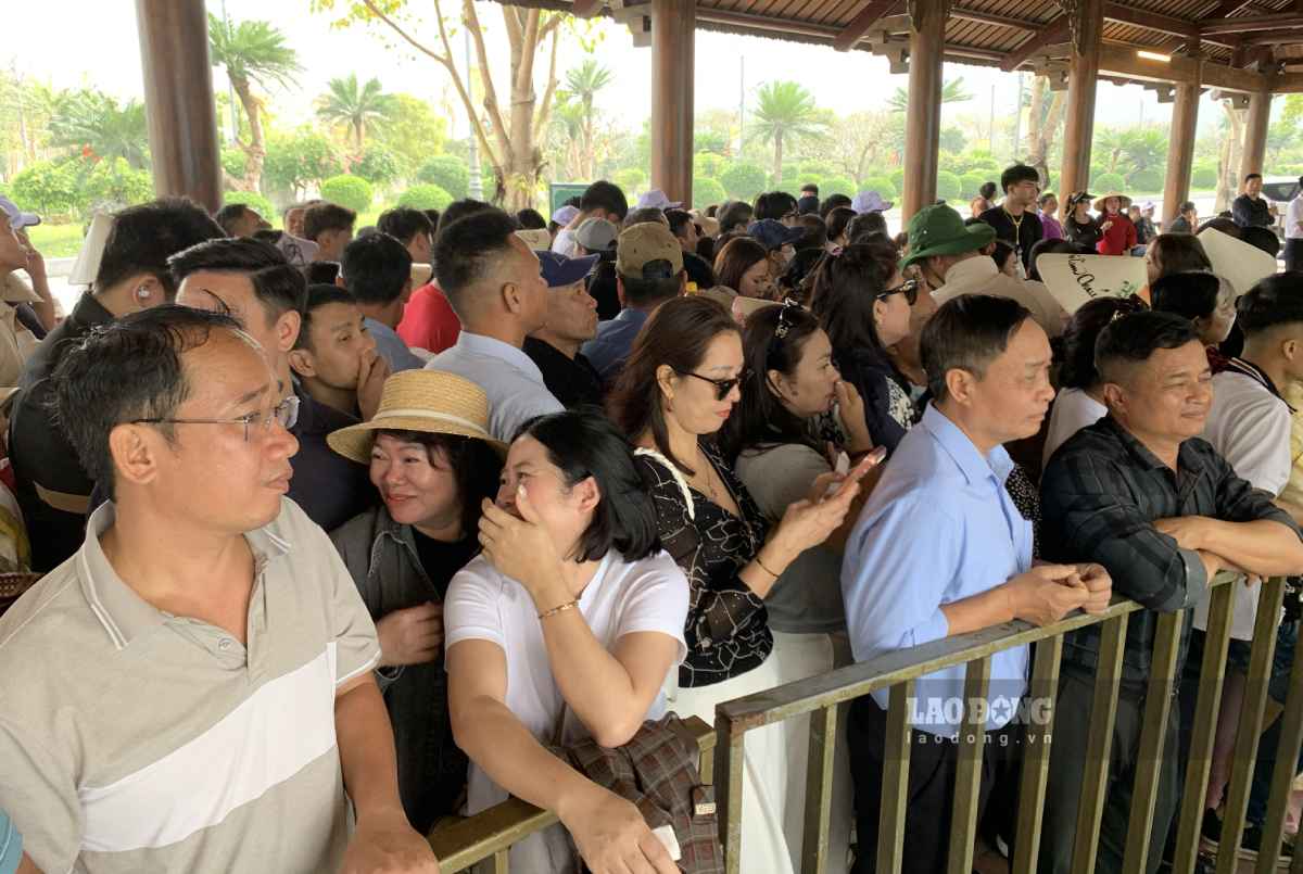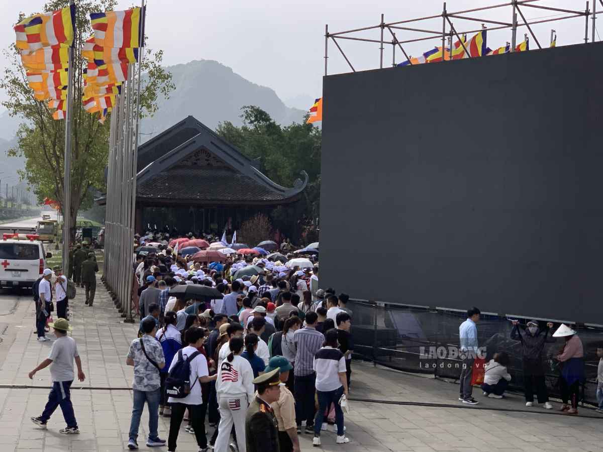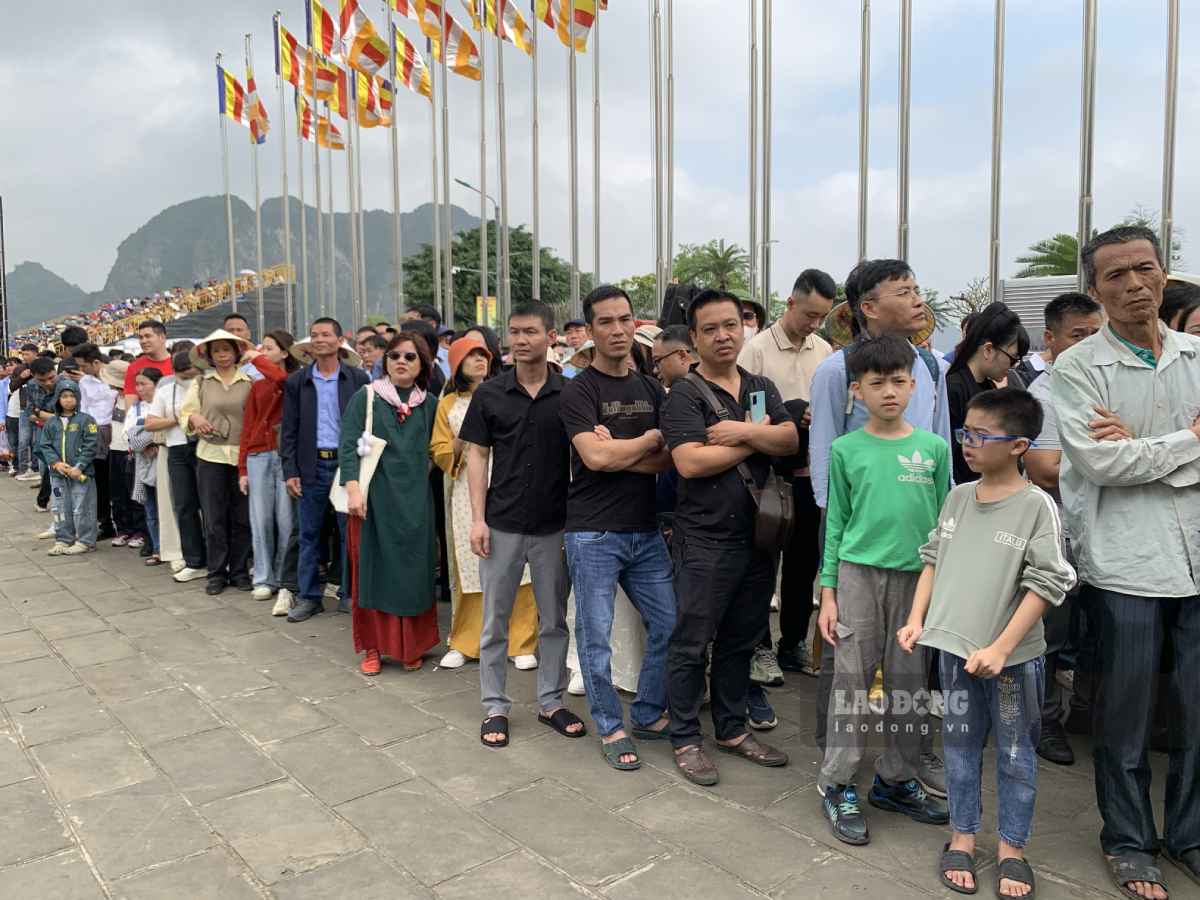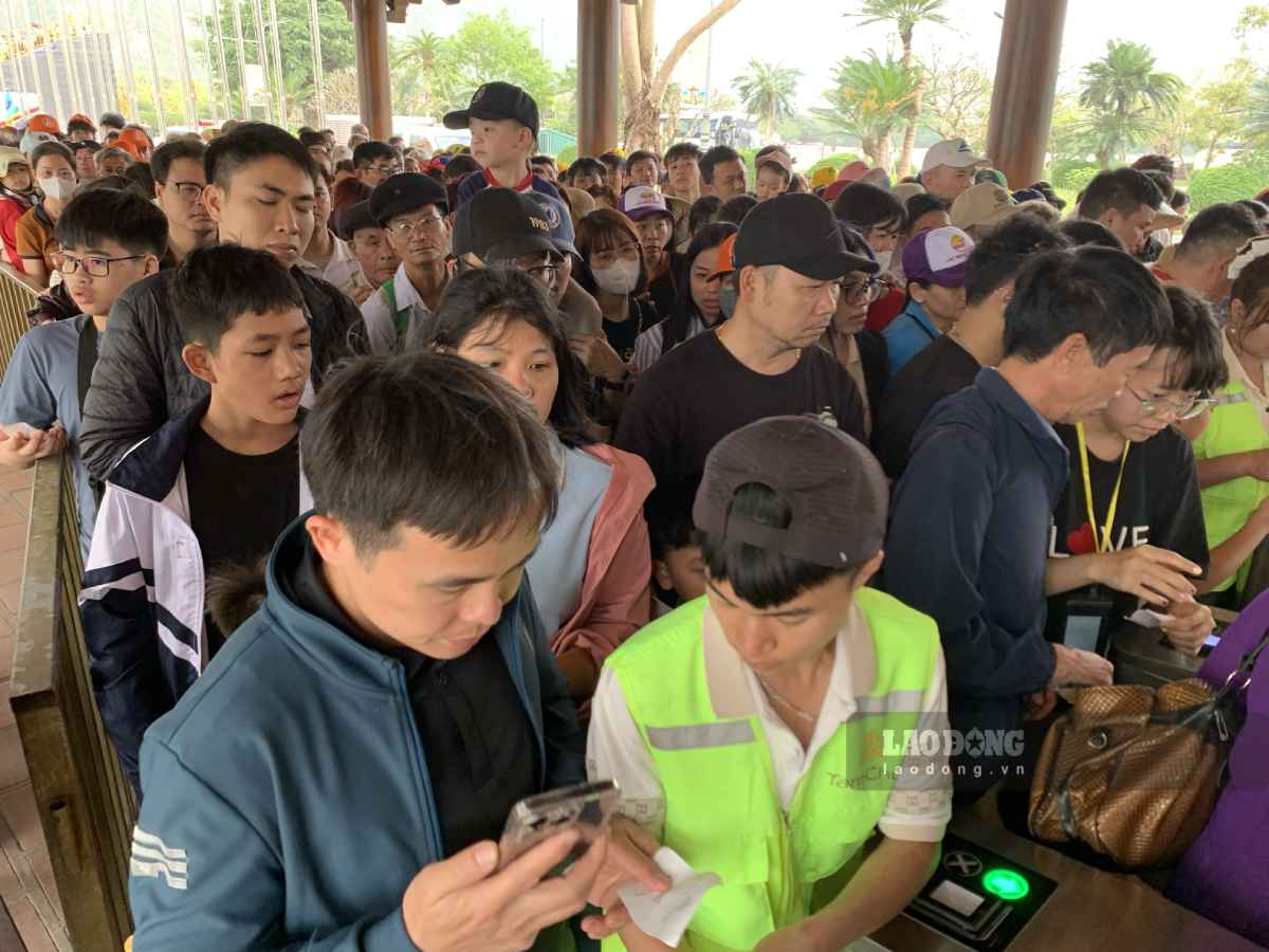 According to reporters of Lao Dong Newspaper, convoys of motorbikes and cars lined up in a row towards Tam Chuc Pagoda. To avoid long-distance congestion, the management board has divided lanes from the waiting house outside to the inside. In the boat wharf area, crowds of people jostled and lined up in long lines waiting for their turn.