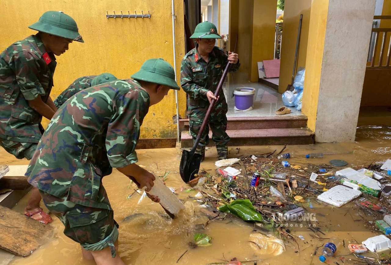 Together with the people, functional forces from the army, police, militia, youth unions... gathered hundreds of people divided into many groups, coordinating together to each alley and stream to support people to overcome the consequences of floods.