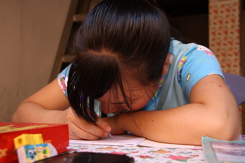 | Kể cả lúc viết bài, em cũng phải cúi sát vở. Ảnh: Hoàng Phương |