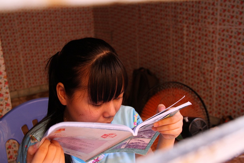 | Khi đọc sách, Lộc phải đưa sách sát mắt mới nhìn thấy được chữ. Ảnh: Hoàng Phương |