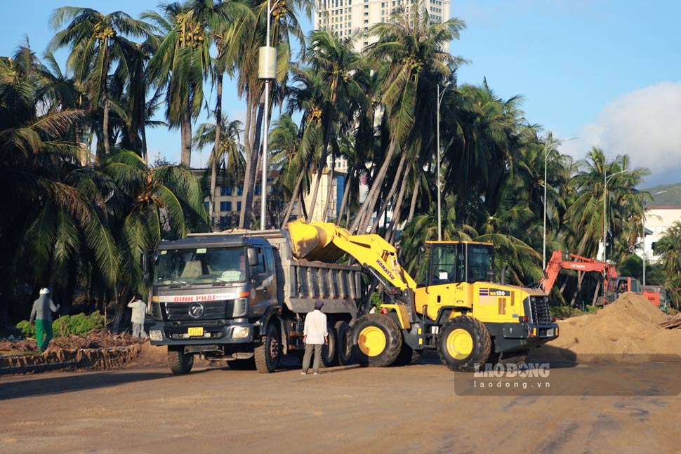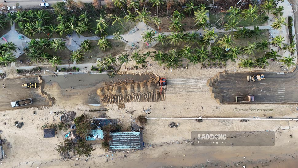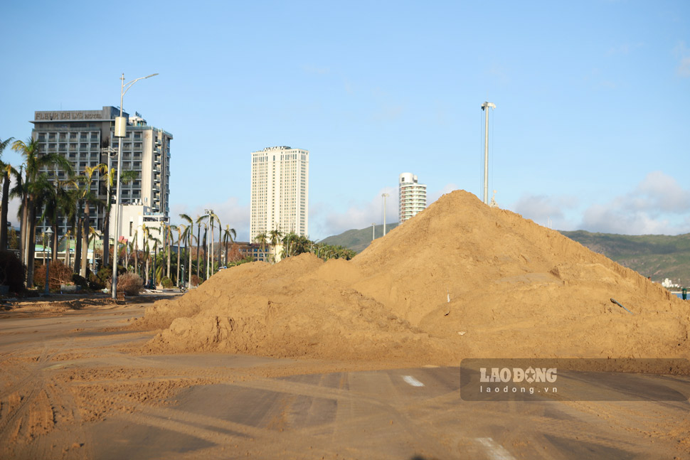 Along the Xuan Dieu sea road, a series of excavators and trucks were mobilized to clear the sand swept away by the storm from the beach. Recorded on the afternoon of November 8, the sand layer is more than 20cm thick, stretching for nearly a distance of a distance, and is being urgently handled by Binh Dinh Environmental Joint Stock Company and Quy Nhon Urban Green Tree and Lighting Joint Stock Company.