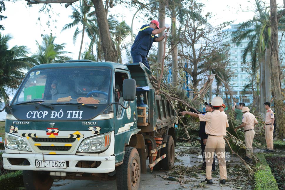 At Quy Nhon Children's Park, dozens of police officers and soldiers were mobilized to trim and clear trees that were knocked down by the storm. On the streets, nearly a dozen environmental staff groups were busy cleaning up and collecting fallen trees and garbage. Everyone was urgent and did not rest, with the desire to bring Quy Nhon coastal city back to life as soon as possible.