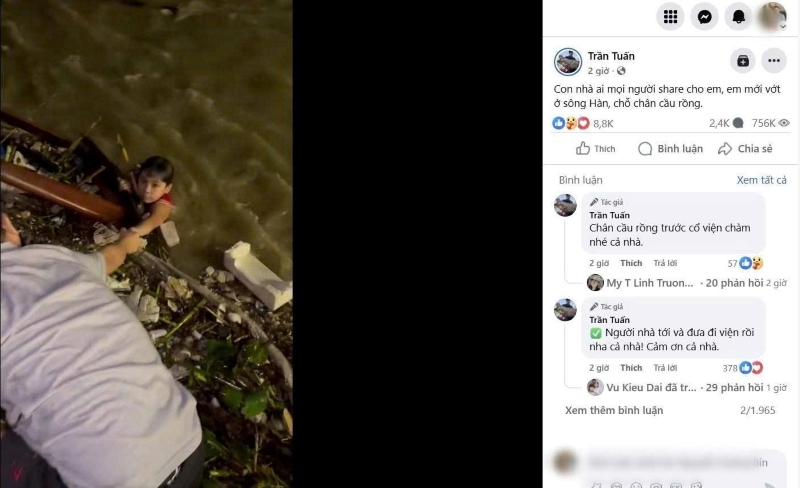 At the time of the incident, prolonged heavy rain caused the water level of the Han River to rise, the flow was strong, and the shore was slippery. Many people around proactively stopped their vehicles, lit their phones, and supported the lighting for the rescue team to operate. After being rescued, the child was helped by local people to change his clothes, take care of him warmly and hand him over to his family.