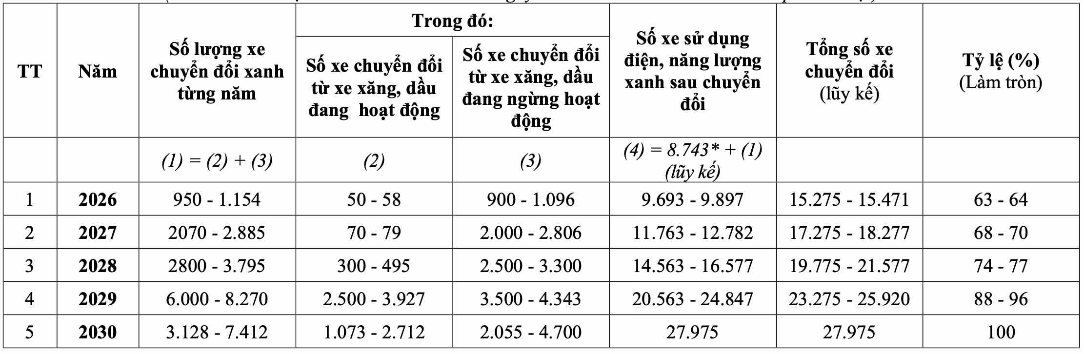 - Phase 2026-2030: Improve mechanisms and policies to support units to convert taxis using gasoline and oil to using electricity and green energy; strengthen communication and propaganda to help people understand and agree; deploy the construction of charging stations at taxi parking spots.