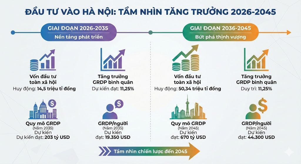 In the period 2036-2045, when basic infrastructure has been synchronously invested, Hanoi will enter a period of in-depth development, with a GRDP scale expected to reach 670 billion USD, and a GRDP per capita of about 44,300 USD. This is an ambitious goal, requiring long-term vision and implementation discipline in investment.