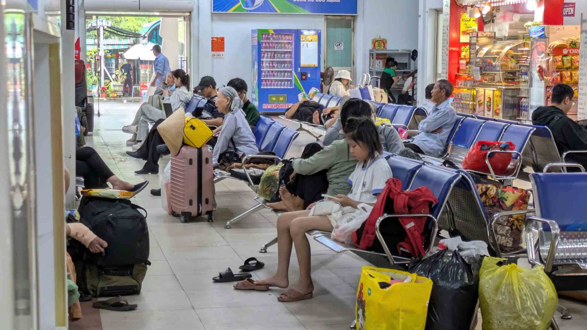 On the afternoon of March 6, recorded at Saigon station, many passengers gathered in the waiting area. Many people had to sit and lie temporarily on rows of seats to wait for information about the trip after the train schedule was disrupted.