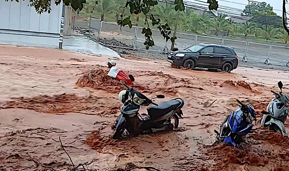Recently, heavy rains caused water from the high hills on Vo Nguyen Giap Street (706B) to overflow, carrying red sand from along 706B Street down to Nguyen Thong Street, Phan Thiet, causing local flooding. The strong flood carried a large amount of red sand down to the road, sweeping away people and motorbikes, affecting people's property. Many incidents like this have occurred continuously over the past month.