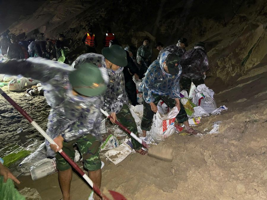 In emergency conditions, the forces divided into many teams, closely following each weak embankment section, transporting soil bags, and erecting temporary reinforced steel baskets. With almost no time to rest, officers and soldiers only have time to eat bread and drink stream water to maintain their strength.