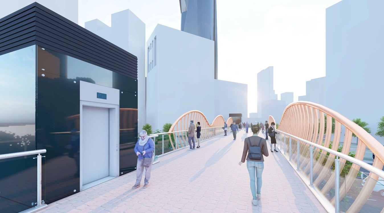 Both ends of the bridge are equipped with steps and elevators, ensuring harmony with the surrounding landscape.
