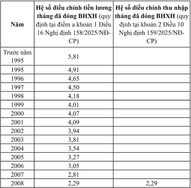 Accordingly, based on the guidance in point a, clause 1, Article 16 of Decree No. 158/2025/ND-CP dated June 25, 2025 of the Government and clause 2, Article 10 of Decree No. 159/2025/ND-CP dated June 25, 2025 of the Government on the formula for determining the adjustment coefficient of salary and monthly income already contributed to social insurance;