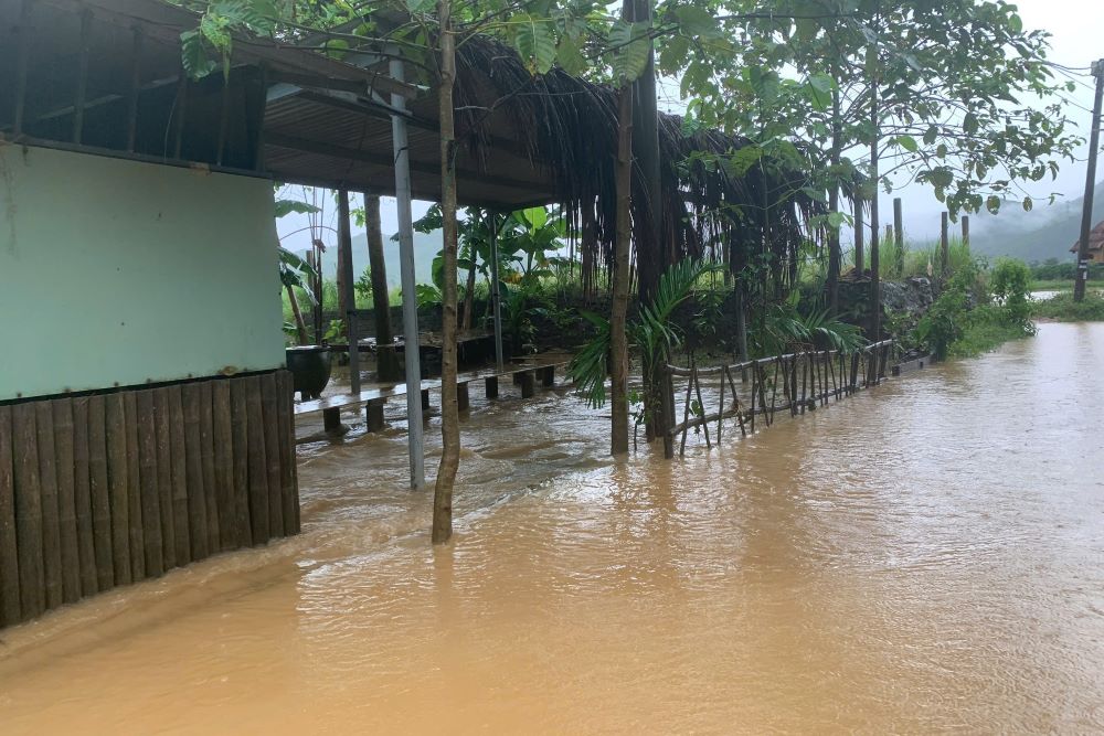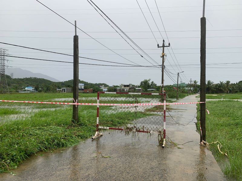 The road leading to Quan Nam 1 village is currently deeply flooded, authorities have erected barriers and put up warning ropes to ensure safety for people and vehicles passing through.