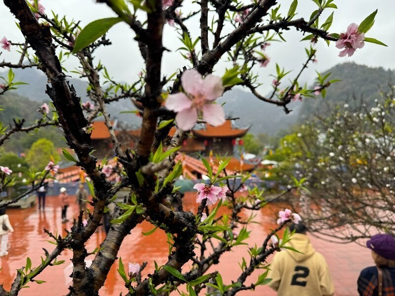 Every Tet holiday, the color of peach blossoms dyeing up mountains and hills further highlights the majestic and contemplative beauty of the pagoda at the forefront of the Fatherland.