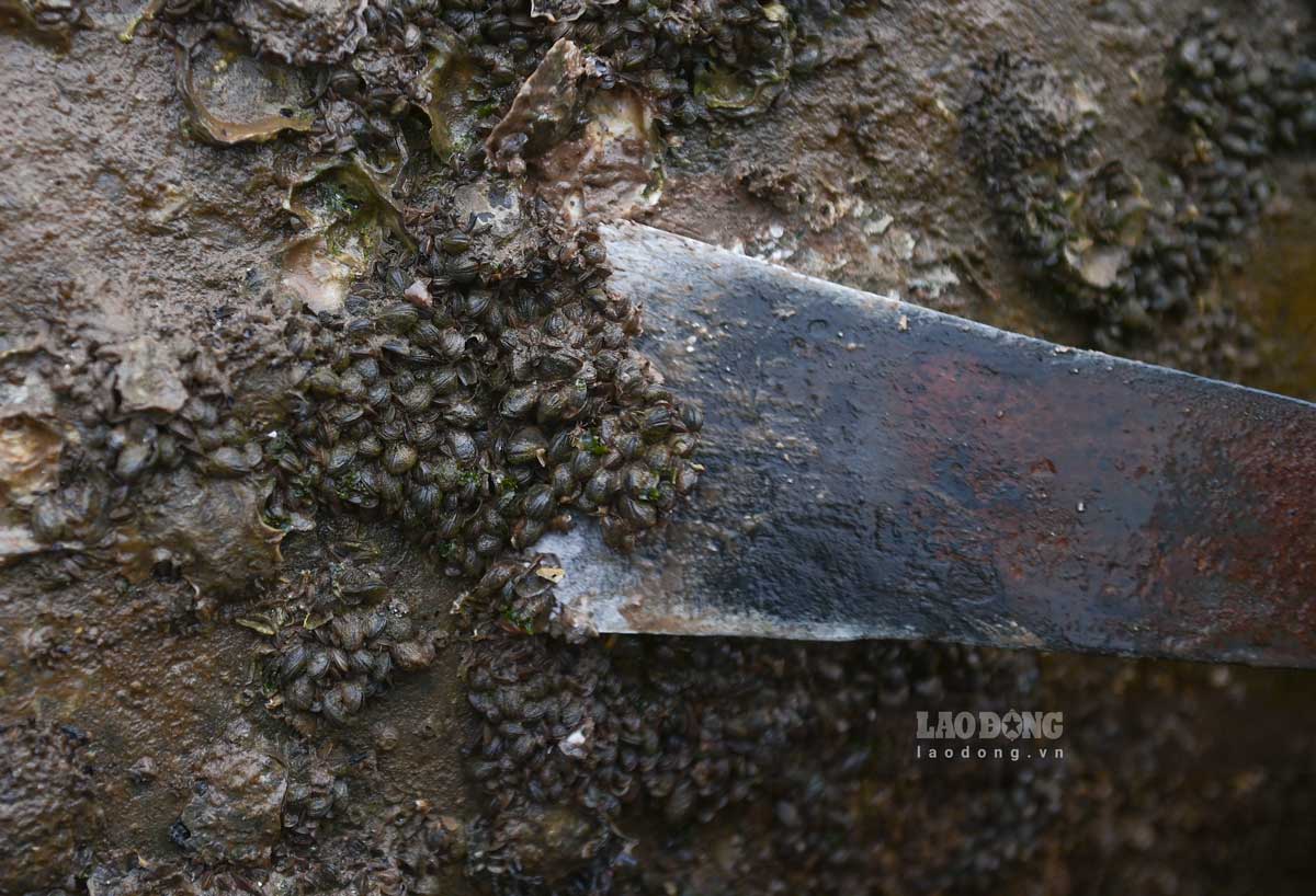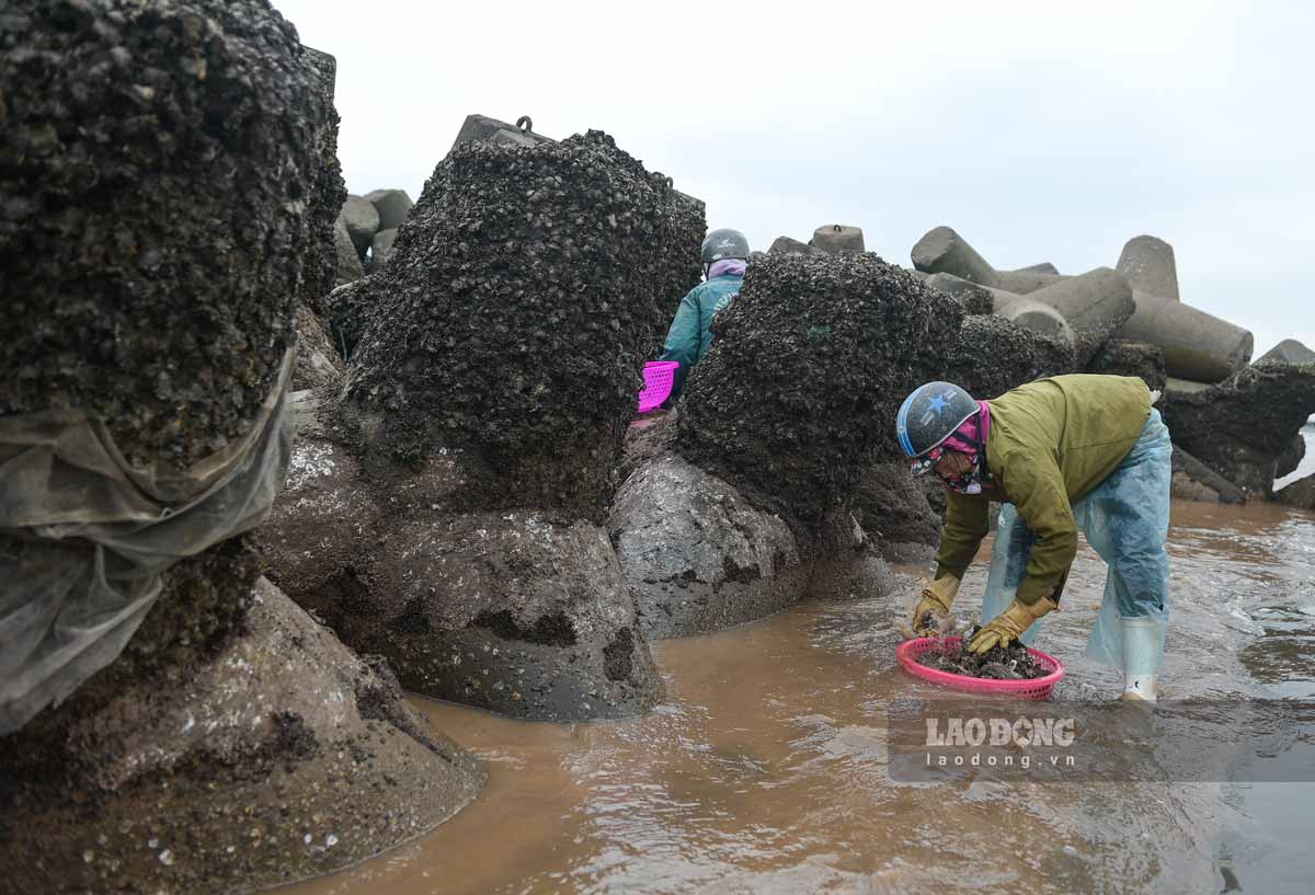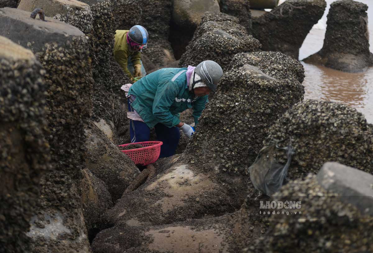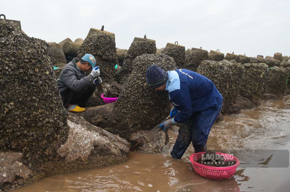 Quickly prying each piece of scale attached to the concrete blocks, Ms. Nguyen Thi Dung (resident of Giao Ninh commune) said that when the weather turns cold, it is also the scale season. When the tide recedes, scales stick densely to the blocks of concrete components blocking the coastal waves, so it is very easy to harvest.