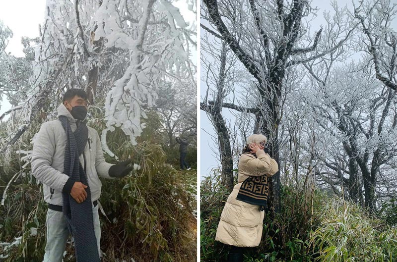 According to information from officials working at the FM broadcasting station of Voice of Vietnam on Phia Oac peak, ice began to form from dawn and gradually dissipated when the temperature increased. At the time of ice appearing, the recorded temperature was about -1 degree C.