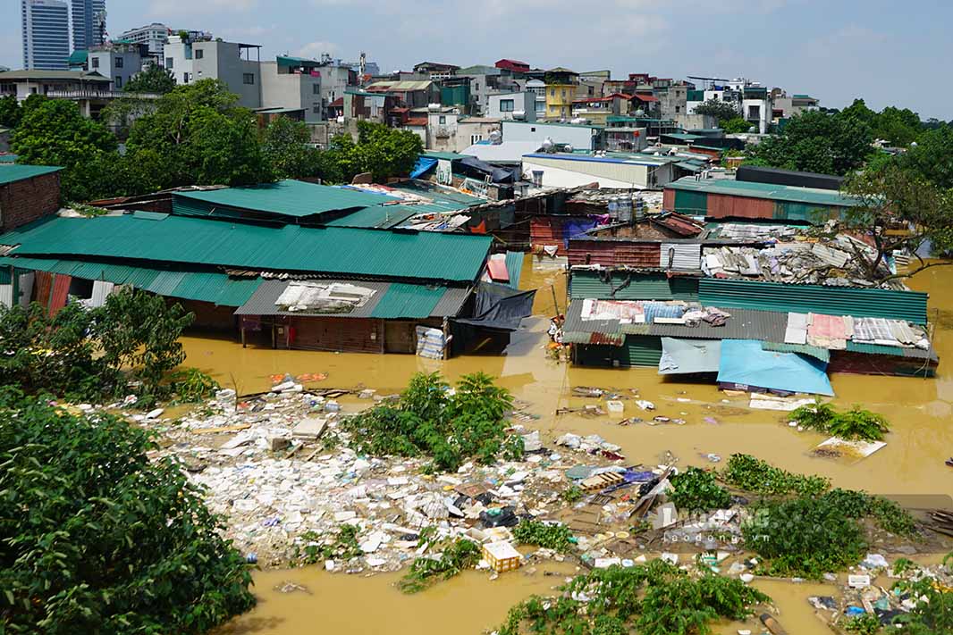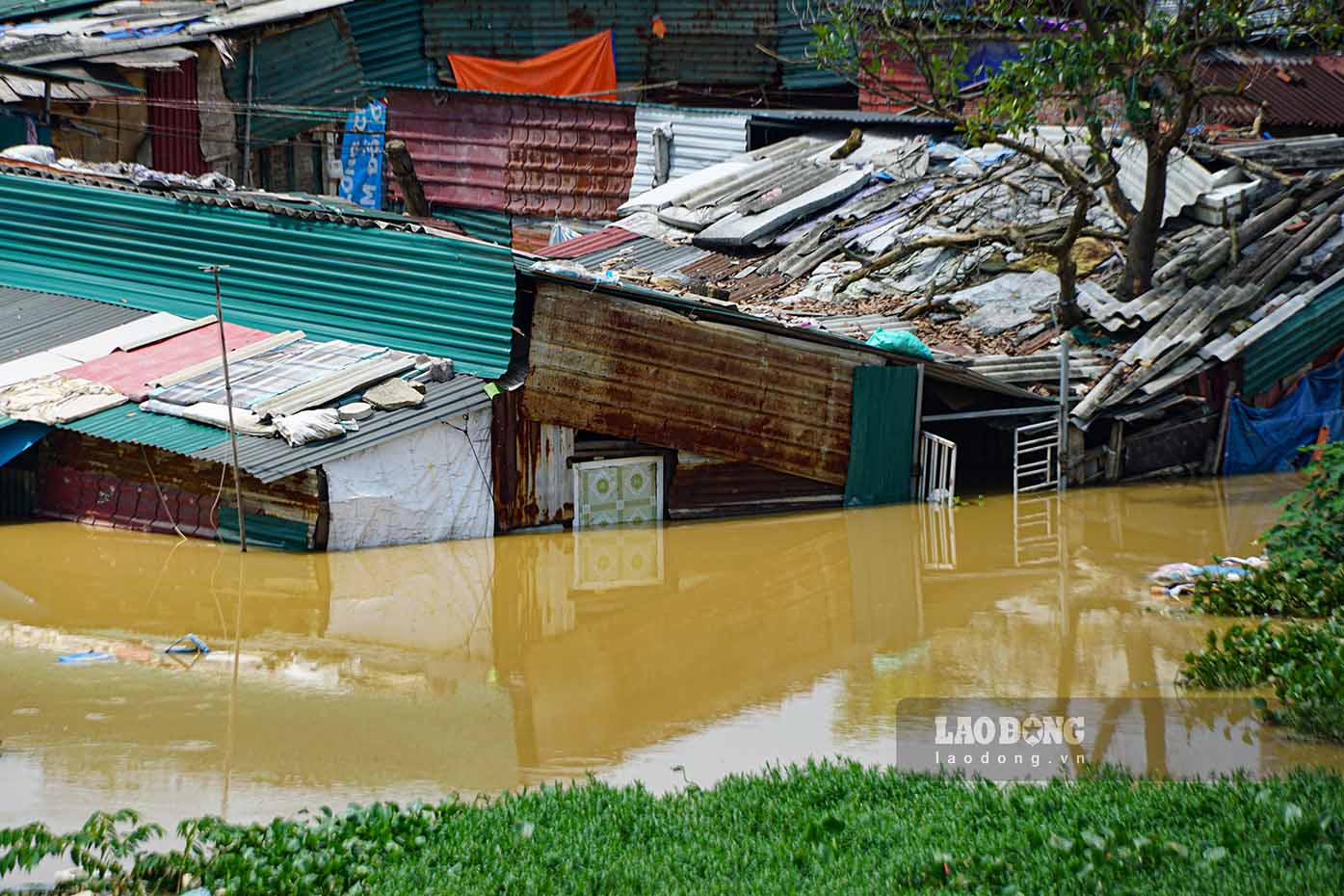 On October 2, Lao Dong reporter recorded in the Red River area through Long Bien and Chuong Duong bridges, floodwaters rose, many houses at the foot of the bridge were deeply flooded, some places had water almost touching the roof. The central beach area was once home to many households but was completely isolated.