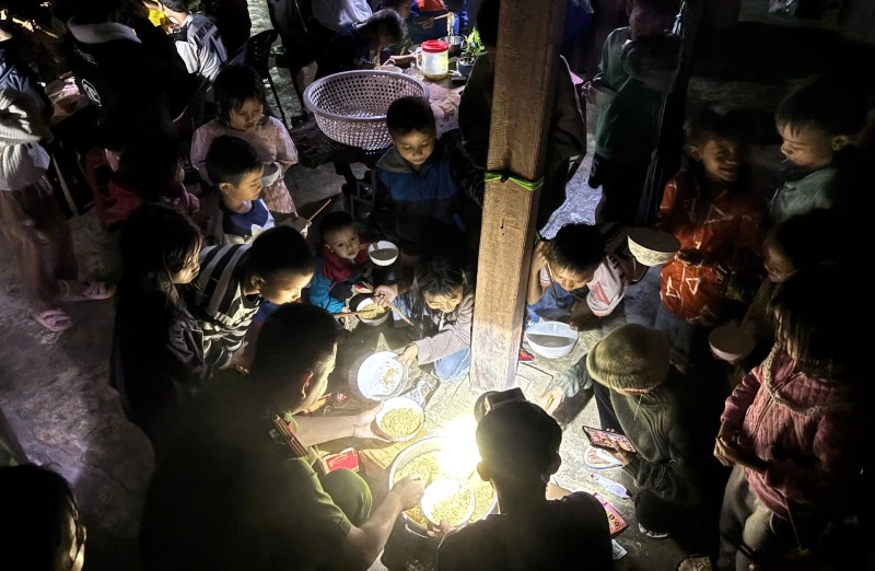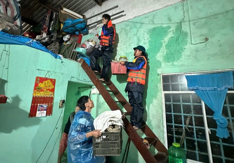 Not only in Da Nang, in the mountainous commune of Tra Leng - where prolonged heavy rain caused serious landslides, nearly 200 people were evacuated by Tra Leng commune police to headquarters for safe shelter. On the night of October 26, amid the cold rain and floodwaters, the police officers cooked instant noodles and shared warm meals with the people.