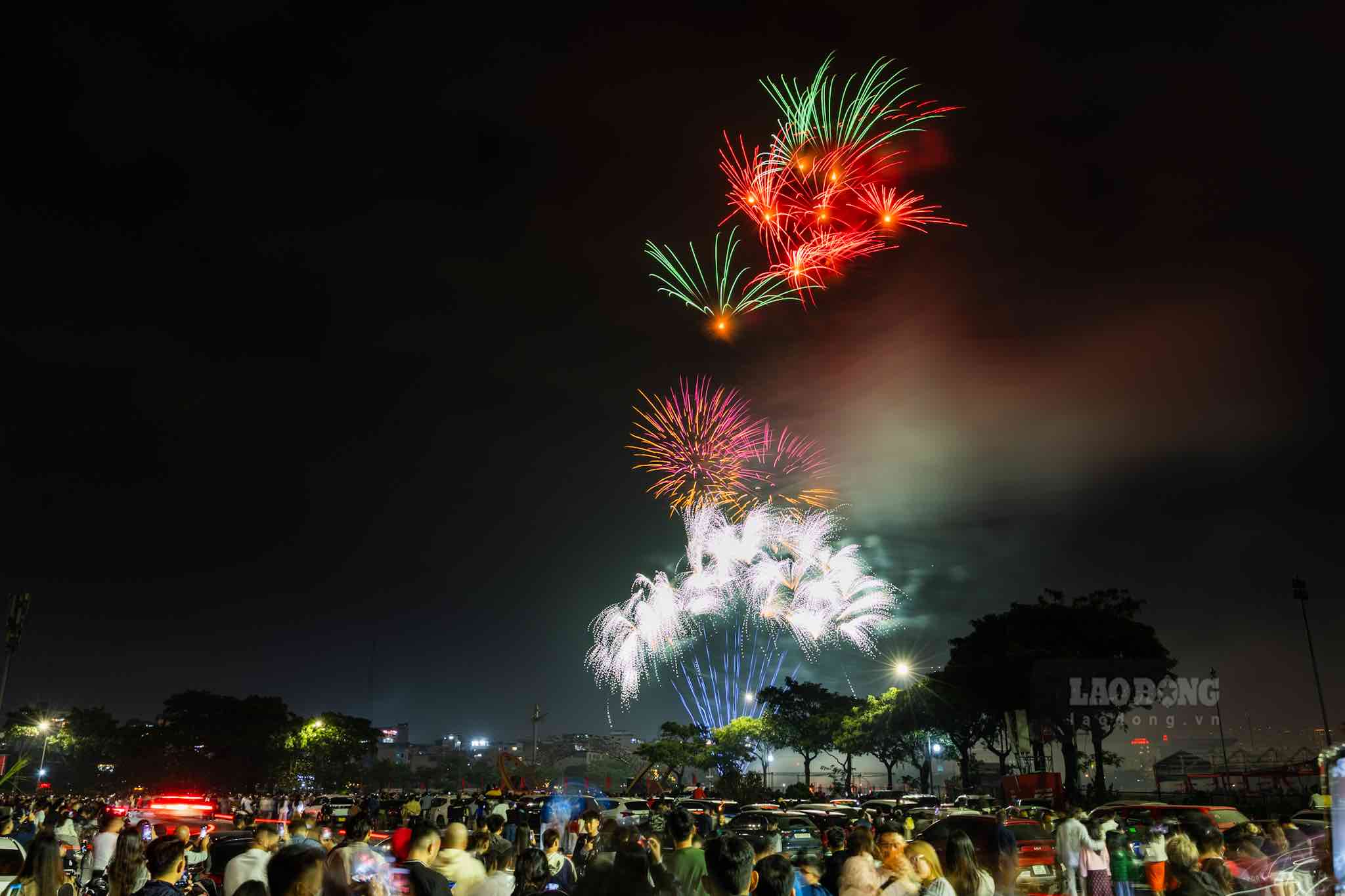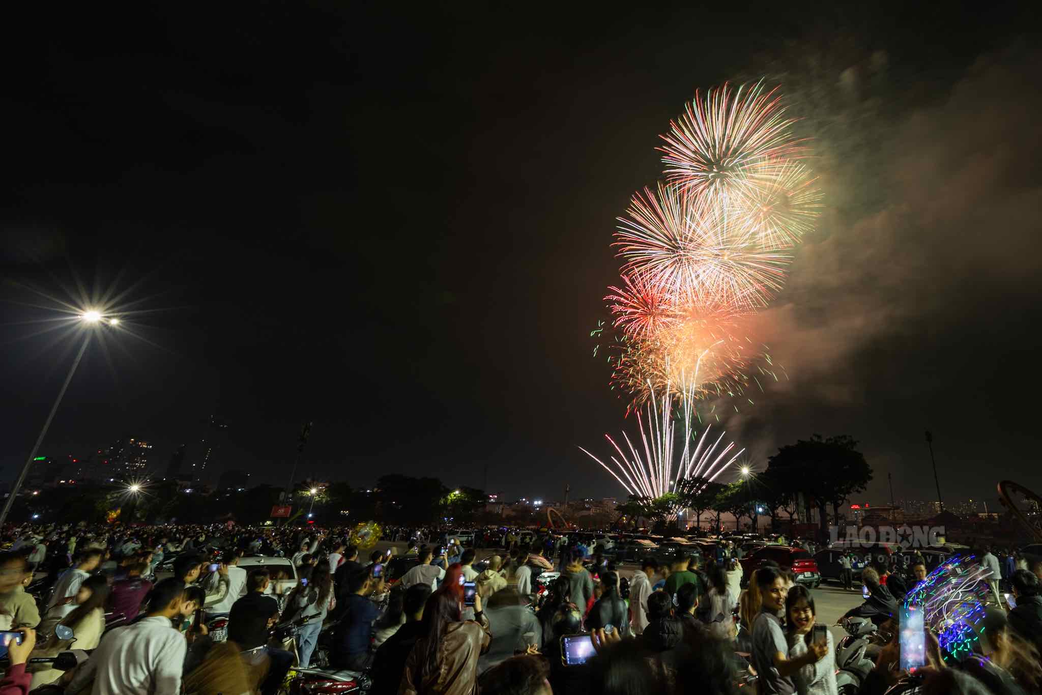 Exactly at 0:00 on February 17, fireworks shone brightly in the sky of Hanoi.