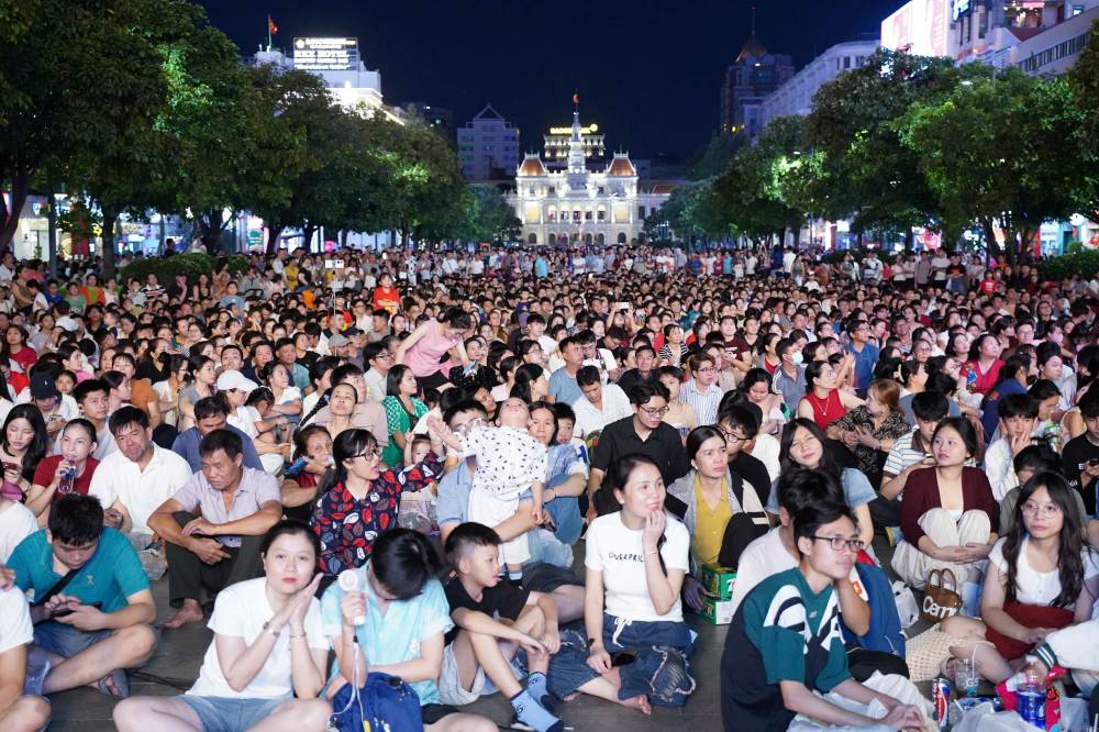 Ms. Nguyet Minh (Bay Hien ward) excitedly shared that her family was present quite early to choose a beautiful location in the Ben Bach Dang park area. When fireworks began to be fired into the sky, the whole space seemed to light up, very touched and proud.