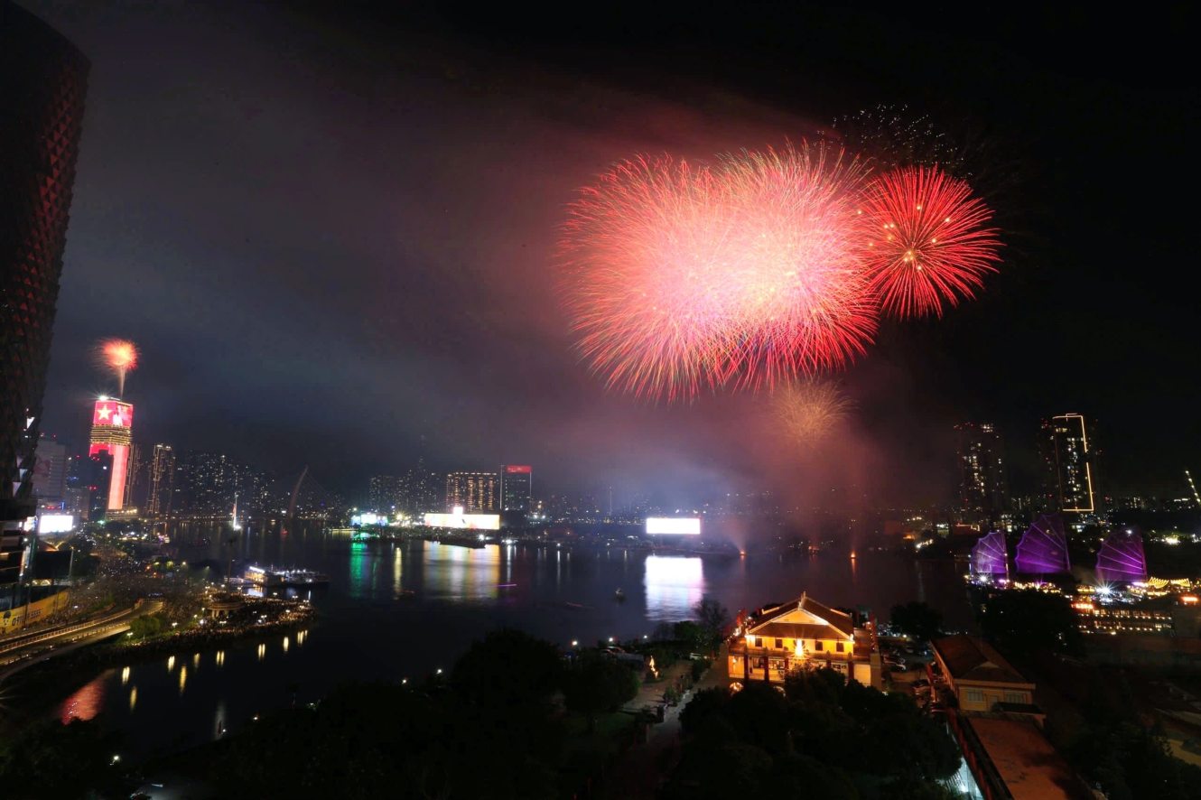 The city center space becomes brilliant and vibrant when fireworks continuously bloom on the night sky, stretching along many colors.