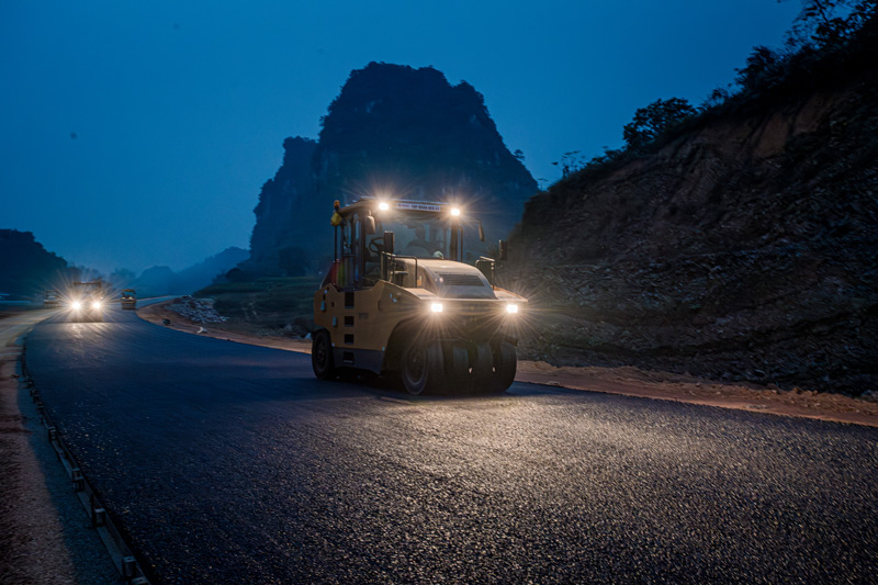 At Km58, Dong Khe commune, the asphalt paving line is maintained continuously day and night, with an output of about 2,000 tons per day.