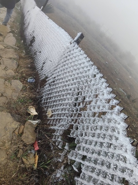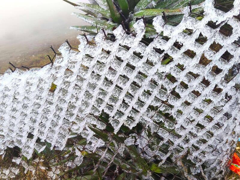 Along the trails leading to the top of the mountain, the familiar steel mesh fences are now completely covered in ice. Each mesh is thickly frozen, arranged evenly, stretching along the slope.