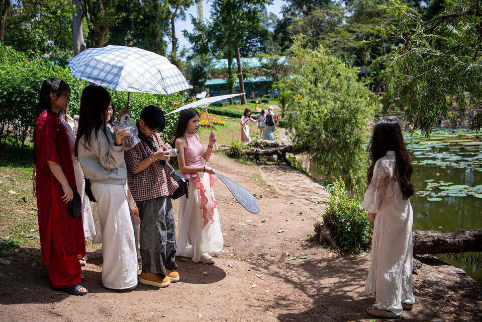 According to Lao Dong newspaper's records, the entrance area of Saigon Zoo and Botanical Gardens is always crowded with people. The bustling spring atmosphere covers all the inner-area streets when streams of people wearing ao dai, carrying food and carpets flock to the grassy fields shaded by ancient trees.