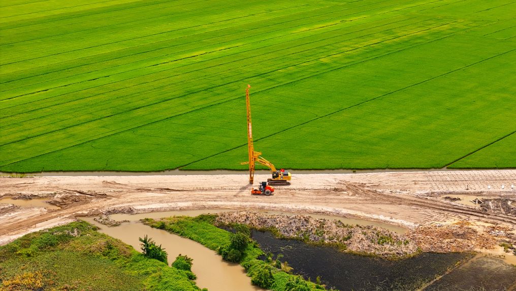 Construction of sand embankment, main route with K95 sand layer (to the layer of waterproof wick) 10.54/30.02km, construction of waterproof wick to improve the foundation 2.5km; service road and service road with K95 sand layer 22.6/38.96km.