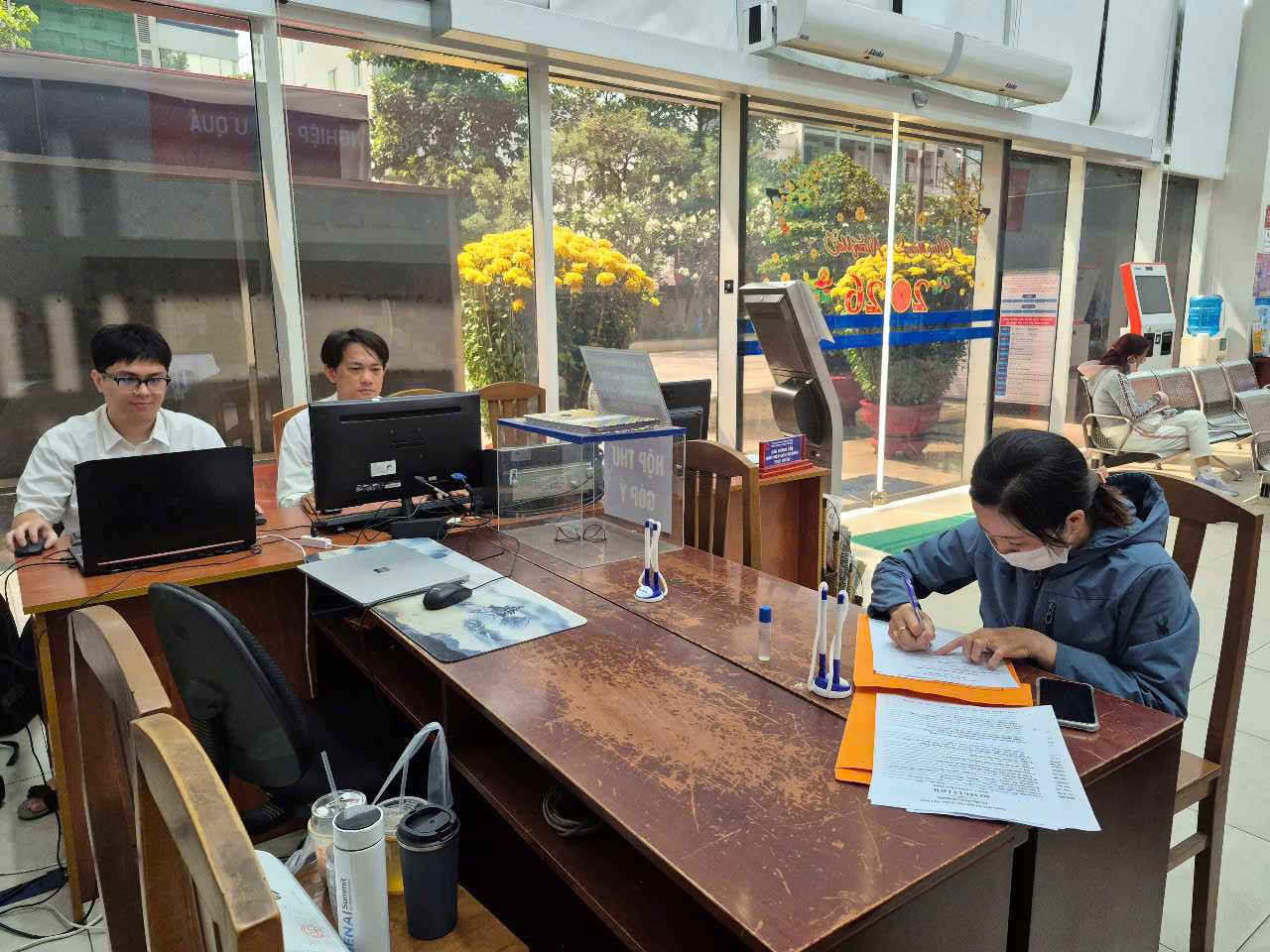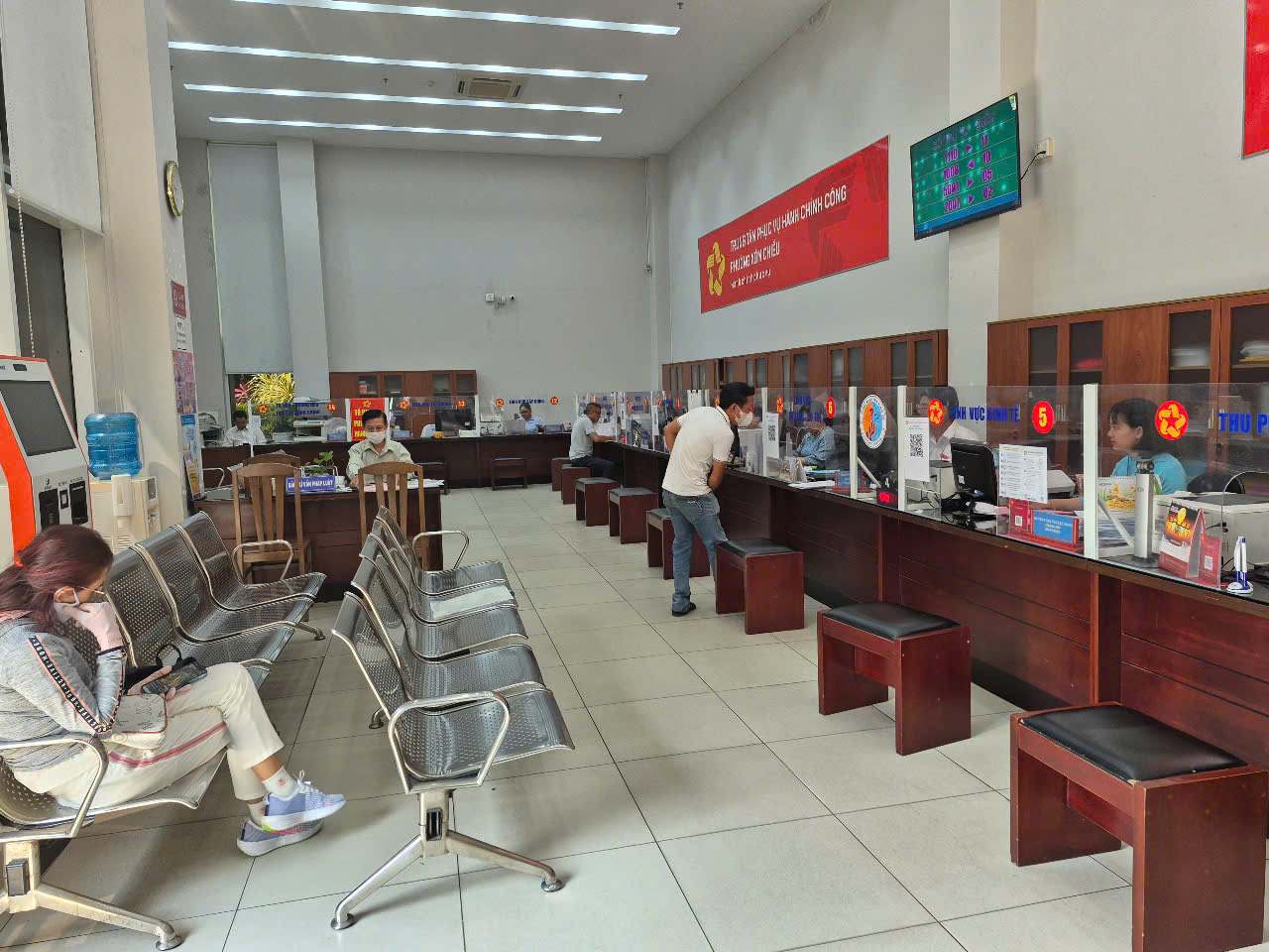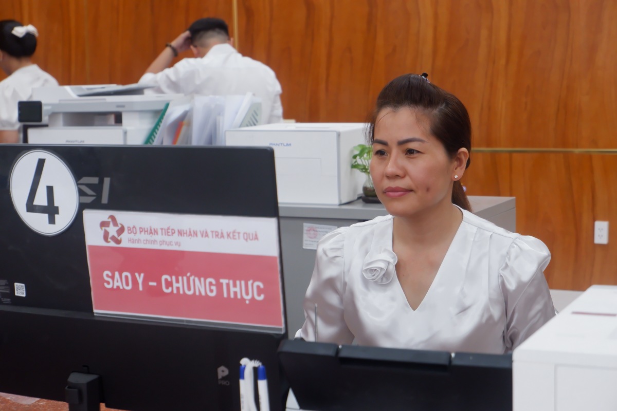 Recorded at the Public Administration Service Center area, the working atmosphere is serious, ready to serve people present to complete procedures.