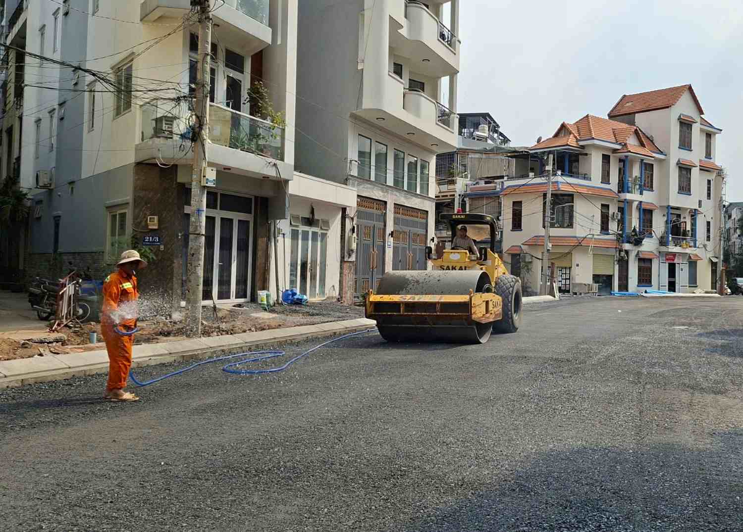 Workers are compacting the roadbed, preparing to pave asphalt; the sidewalk bundle has been installed, waiting for sidewalk bricks to be paved. Although not completely completed, people can already travel by motorbike through this section.