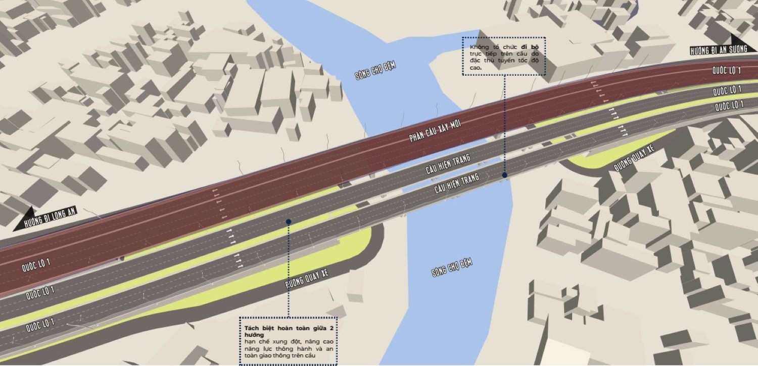 At Binh Dien bridge across the Cho Dem river, the project builds two more parallel bridges, each bridge with 2 lanes, next to the existing bridge with 8 lanes.