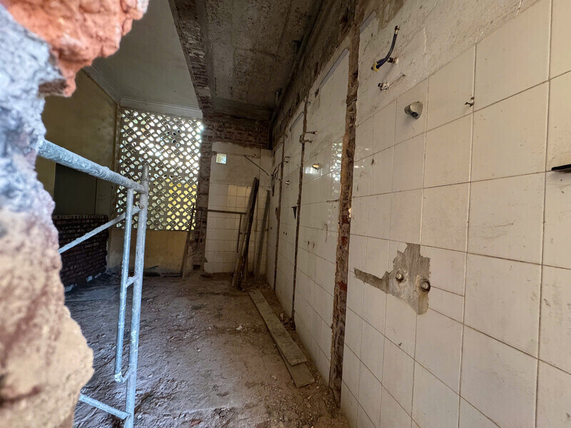 The old offices were empty, the floor was peeling off in pieces. Wood doors and iron doors were dismantled and piled up outside the yard; many walls were peeling and black.