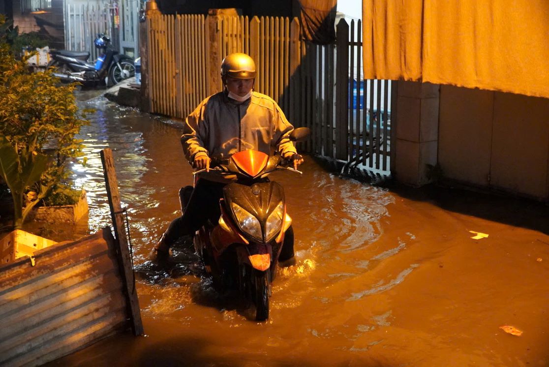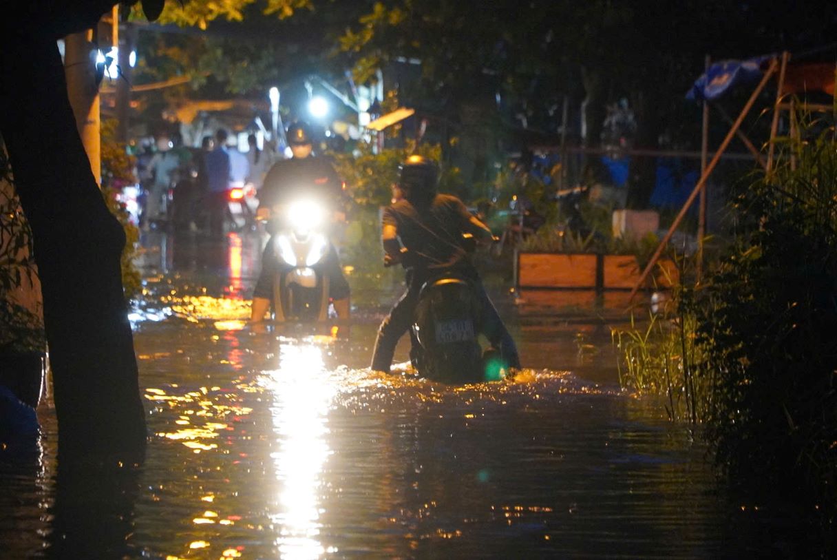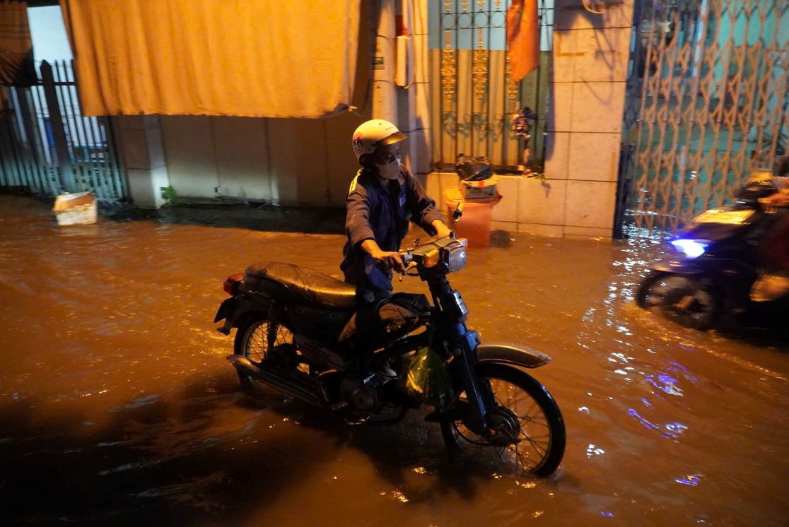 The most heavily flooded area is the section near the canal bank near Phu Dinh ferry terminal. The deep flooding and darkness made it difficult for people to move here, a series of motorbikes stalled in the middle of the water, forcing people to get off and walk.