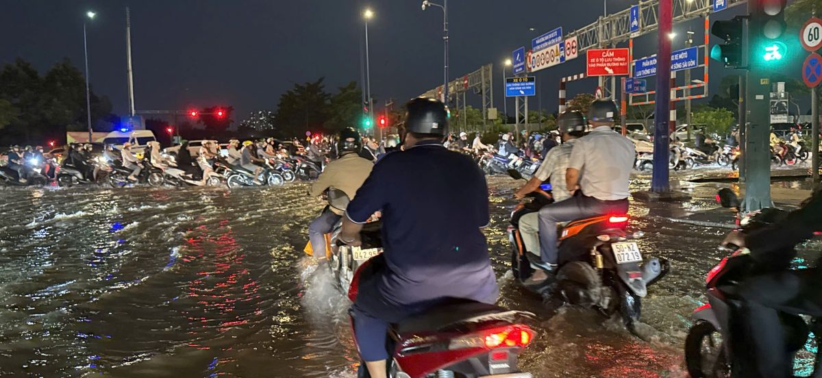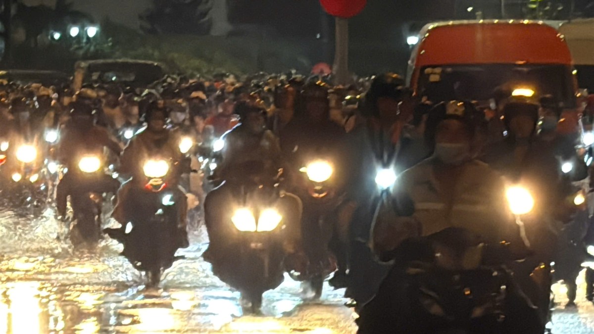 The flooded road happened right at rush hour, causing traffic congestion for kilometers, making it very difficult for people to move. The authorities had to be present at the scene to regulate traffic and not allow vehicles to pass through deeply flooded areas to ensure safety.