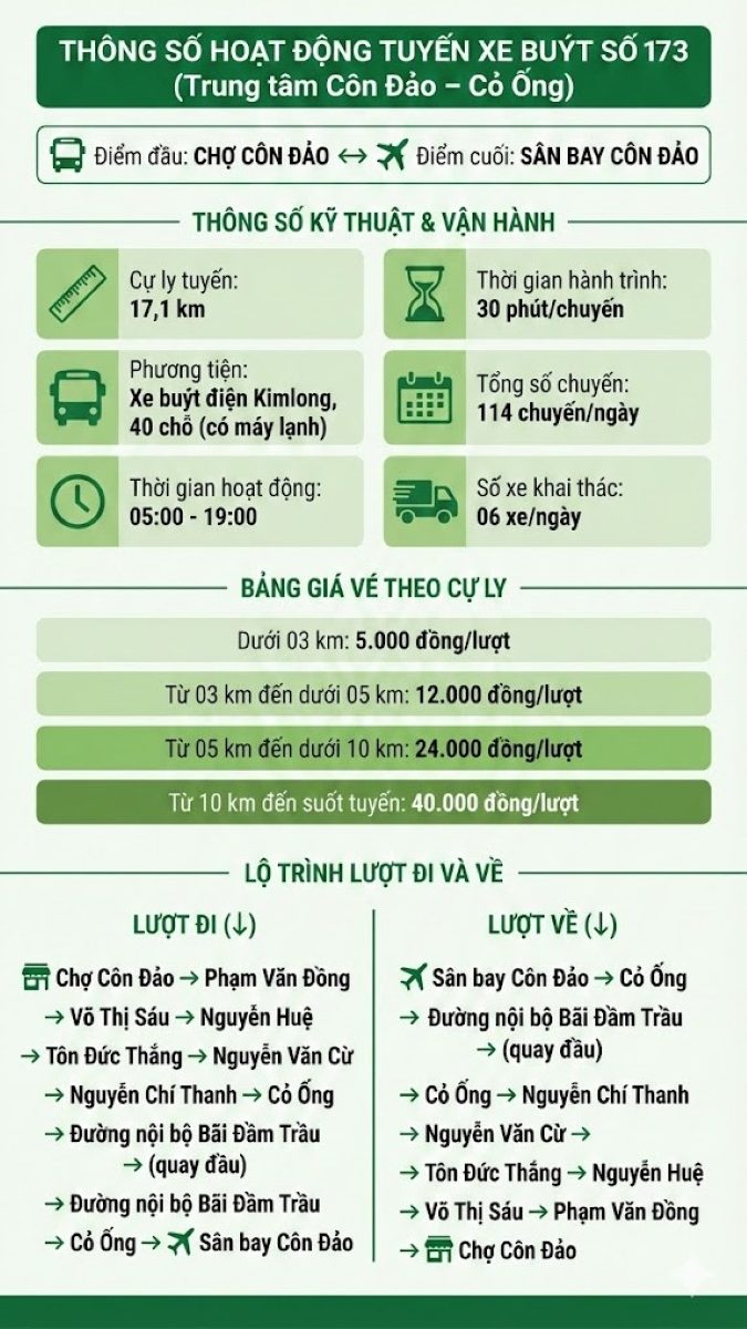 On December 24, the Public Transport Management Center (HCMC Department of Construction) announced that it will officially put into operation the 173 electric bus route connecting Con Dao Center - Co Ong Airport (also known as Con Dao Airport) from December 25.