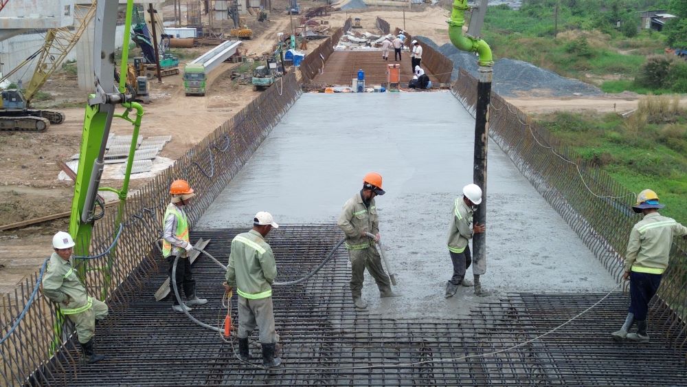 Taking advantage of favorable weather, contractors mobilized all equipment to simultaneously construct complex items. Upstairs, groups of workers focused highly on rolling and installing, and guarding the bridge girders to soon connect the spans. Below, the sound of car engines rumbling non-stop, continuously compressing and treating the roadbed to prepare for the next layers of structure. The harmonious coordination between the upper and lower construction points created a bustling scene at the gateway connecting Ho Chi Minh City with Binh Duong.