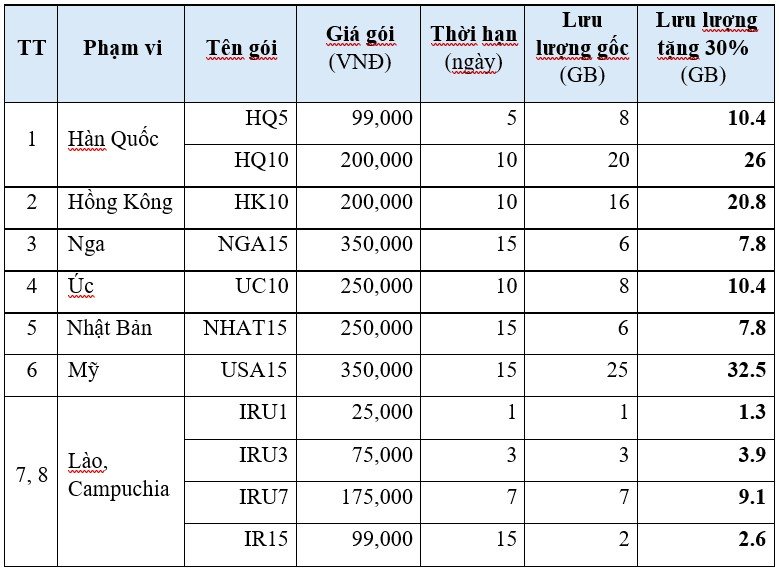 Accordingly, from April 24, 2026 to the end of May 31, 2026, customers who register for Roaming packages in the list will receive two privileges at the same time: Add 30% of Data capacity to the main package account when registering for Roaming packages in the list.