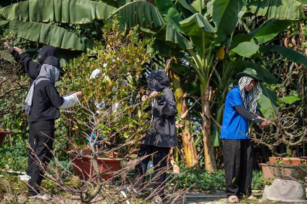 Ông Mai Hữu Đức (chủ vườn mai Tư Hồng, TPHCM) cho biết, năm nay vườn có khoảng 800 chậu mai cần lặt lá trong thời gian ngắn. Để kịp tiến độ, ngay từ đầu tháng Chạp, ông đã chủ động liên hệ tìm nhân công thời vụ, trong đó lực lượng sinh viên chiếm số lượng lớn.