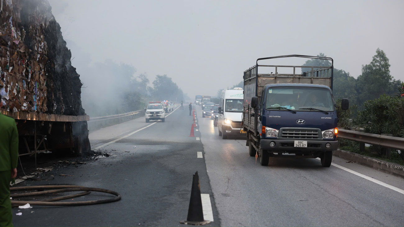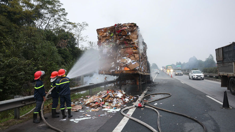 At that time, a semi-trailer carrying scrap moving in the direction of Hanoi - Lao Cai suddenly caught fire at Km42+300 in Tien Lu commune (Phu Tho).